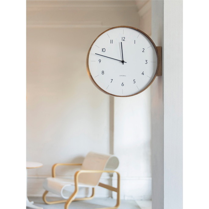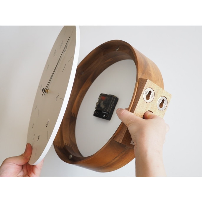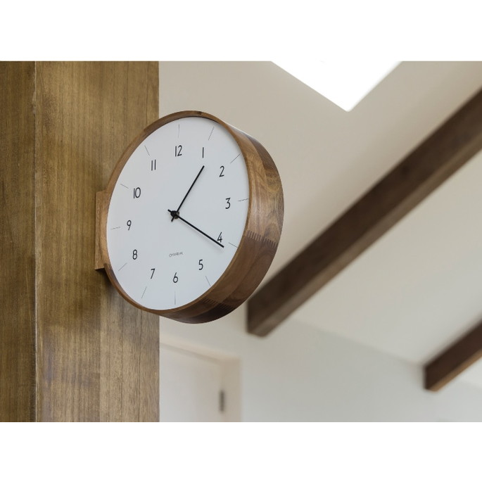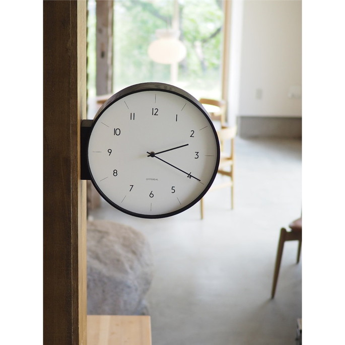 「暮らしに馴染む」をコンセプトにスタートした両面時計がようやく完成しました。木目の美しさが特徴のウッドフレームからは素材のぬくもりだけでなく、職人の手仕事が見て、触れて、感じられます。視認性を高めるため、文字盤デザインを広くしています。程よい存在感で空間にフィットするサイズ感にもこだわりました。