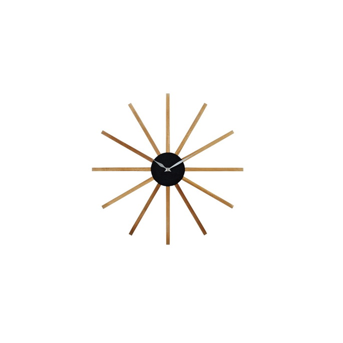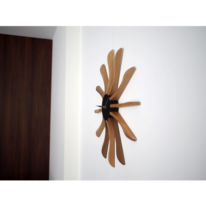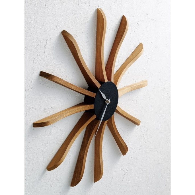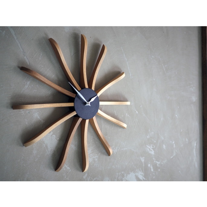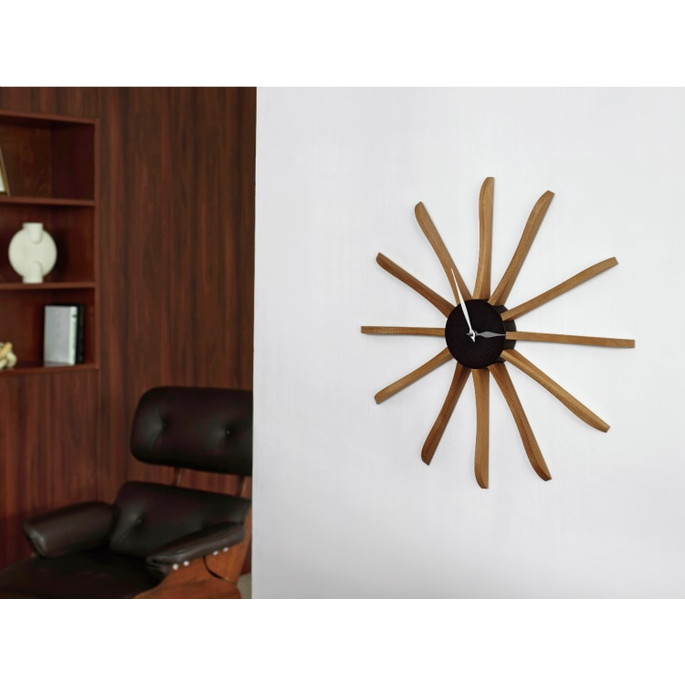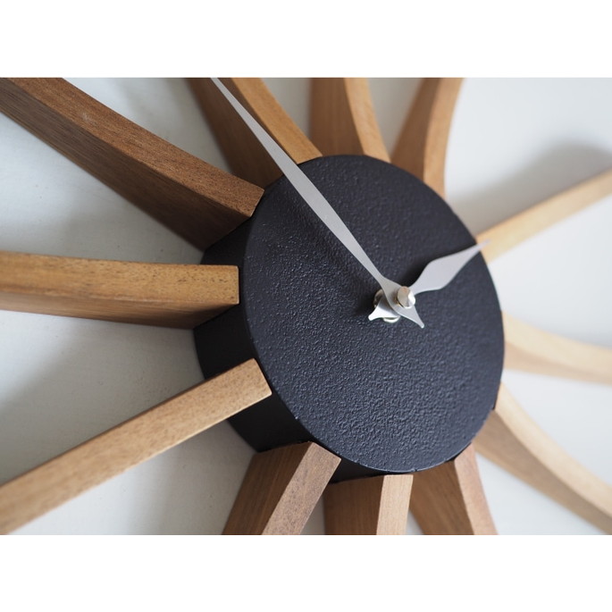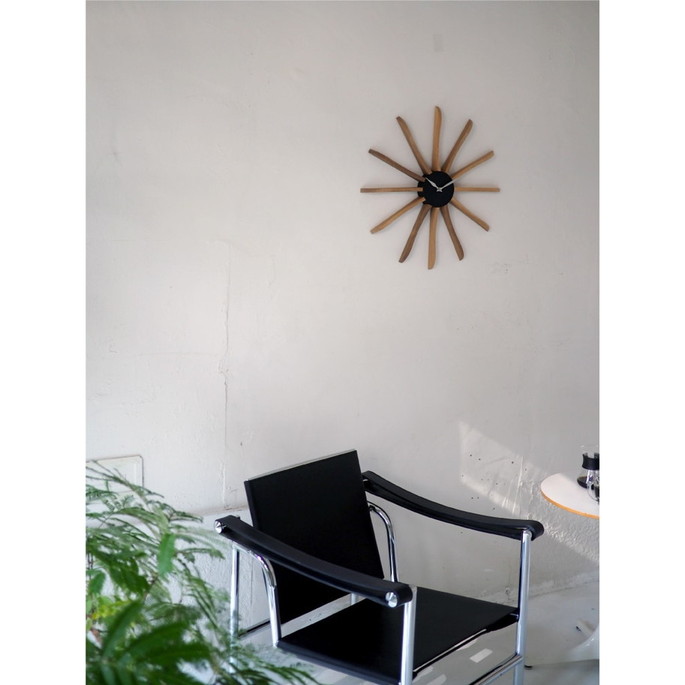 ミッドセンチュリー期を連想させるデザインが魅力のウォールクロック。シックで落ち着いたカラートーンと素材の組み合わせが高級感を演出します。長く伸びたウッドパーツになめらかなウェーブを取り入れたことで親しみを感じられる佇まいに。