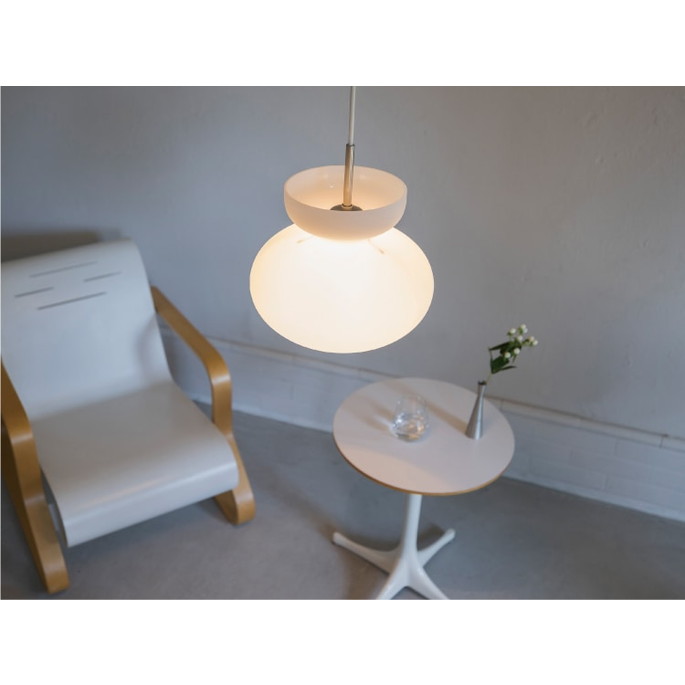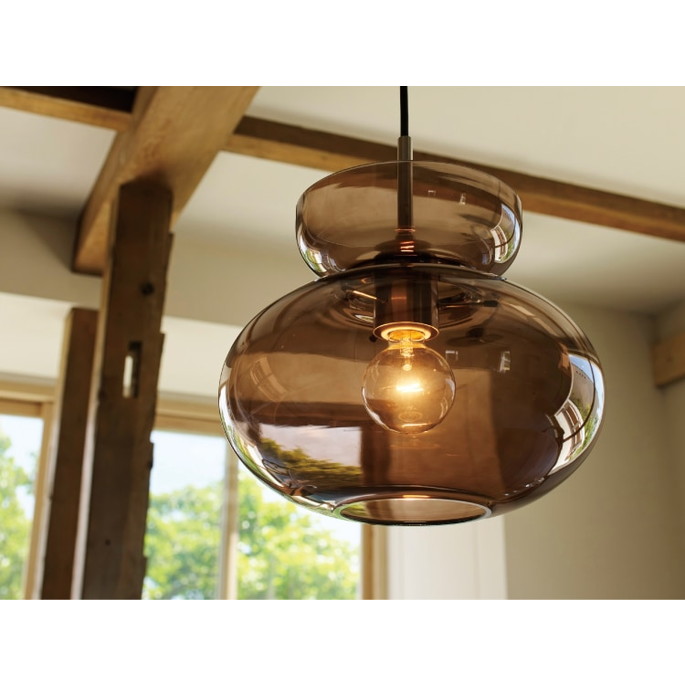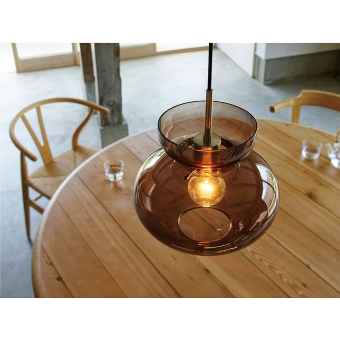 ふくよかなシルエットが不思議な浮遊感を漂わせるデザインのペンダントライトです。たおやかな膨らみと、それを引き立てるくびれをシームレスに表現したガラスセードは対照的な2色をご用意しました。深みのあるブラウンは落ち着いたカラーリングと透明感が共存した、ミッドセンチュリー期を思わせる仕上がりです。清楚感のあるホワイトは電球の光が輪郭をなぞるように、じんわりと広がります。どちらもソケットはヘアライン仕上げのシルバーを合わせました。