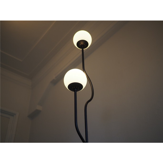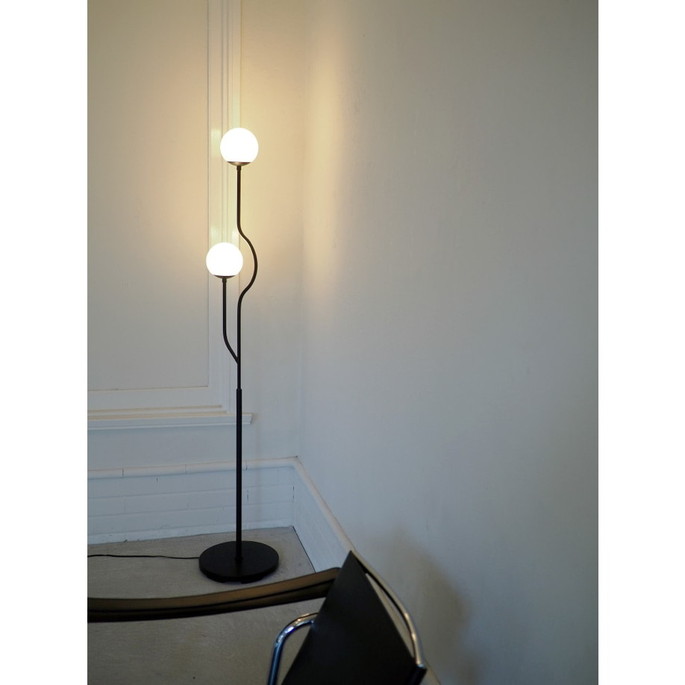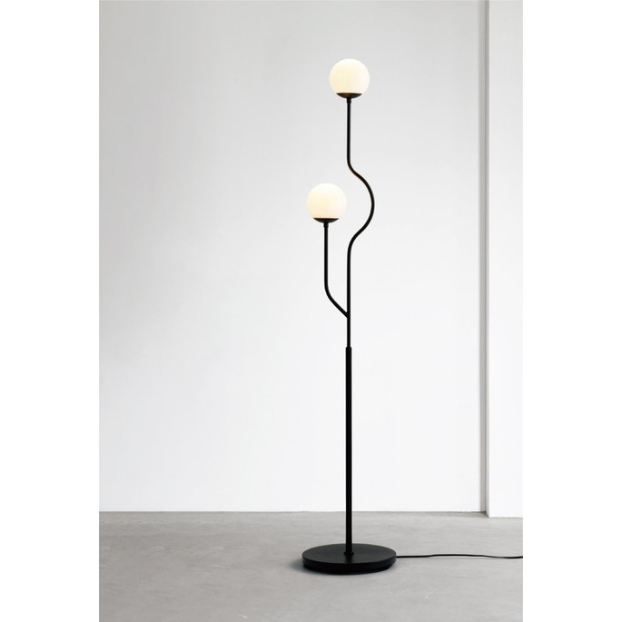 インターフォルムでは珍しい2灯タイプのフロアライト。枝分かれした形状と、光源を迂回させるラインデザインが特徴です。マットブラックで仕上げたカラーがシャープでモダンな印象を与えつつも、街灯のようなやさしい光を灯します。オブジェのような洗練された佇まいは消灯時にも健在。
