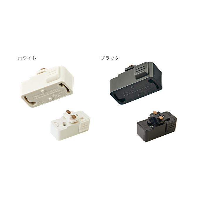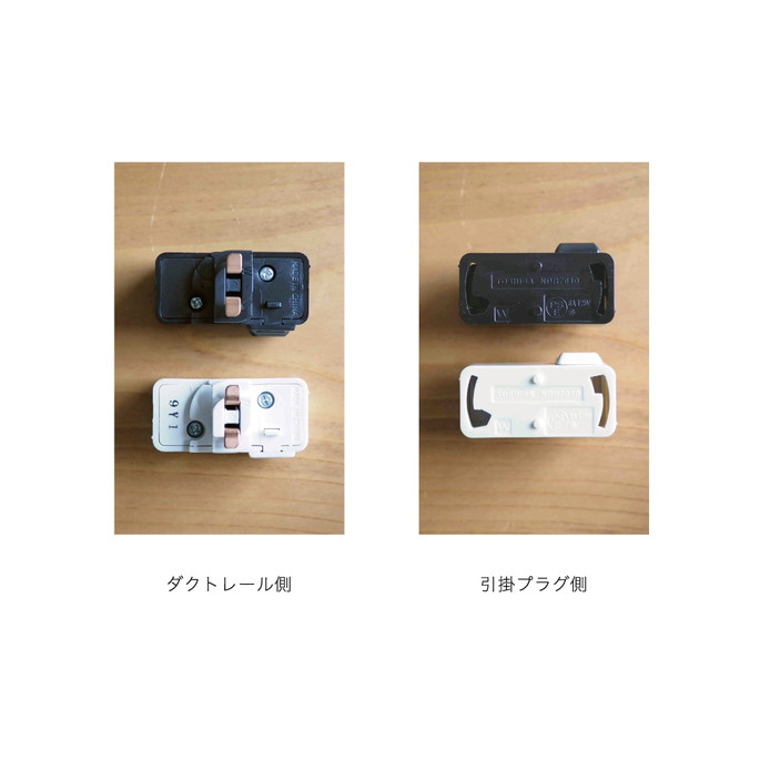 引っ掛けプラグのついた照明器具をダクトレールに取り付けるための変換プラグです。上側がダクトレール用、下側が引掛プラグ用の差し込み口になっており、そのままでは取り付けができなかった照明器具が取り付けられようになります。