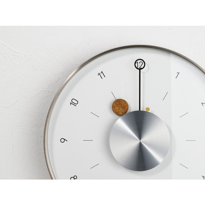 惑星をイメージした丸い針が公転するコズミックなテーマを基にデザインされています。木製の短針は木星を、金色の秒針は金星をモチーフにしており、それぞれを連想させる温かみのある素材感とカラーが特徴です。長針は太陽系で最も遠い惑星である海王星をイメージし、神秘的な宇宙の広がりを感じさせます。シルバーのフレームと中央のプレートは銀河の無限の可能性を表現しています。