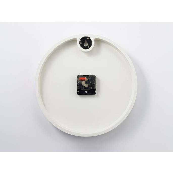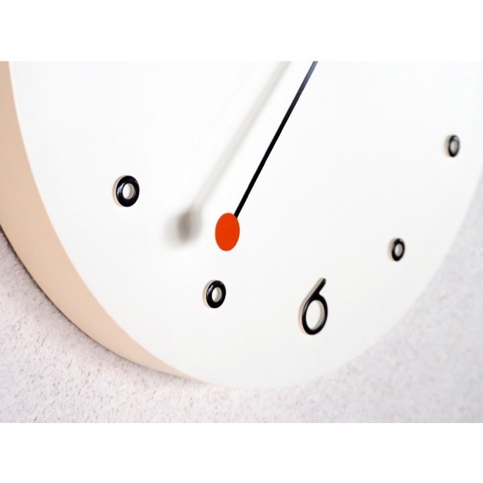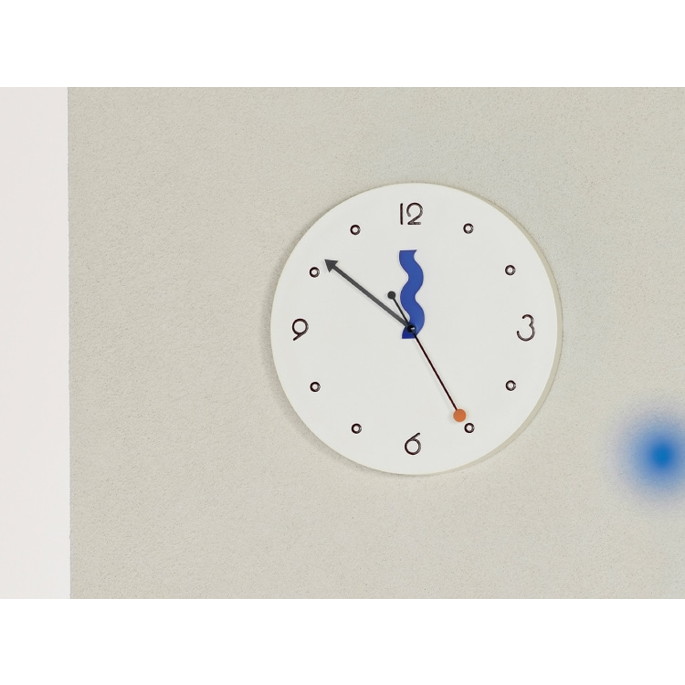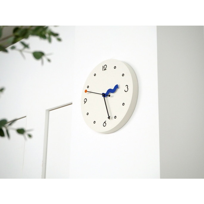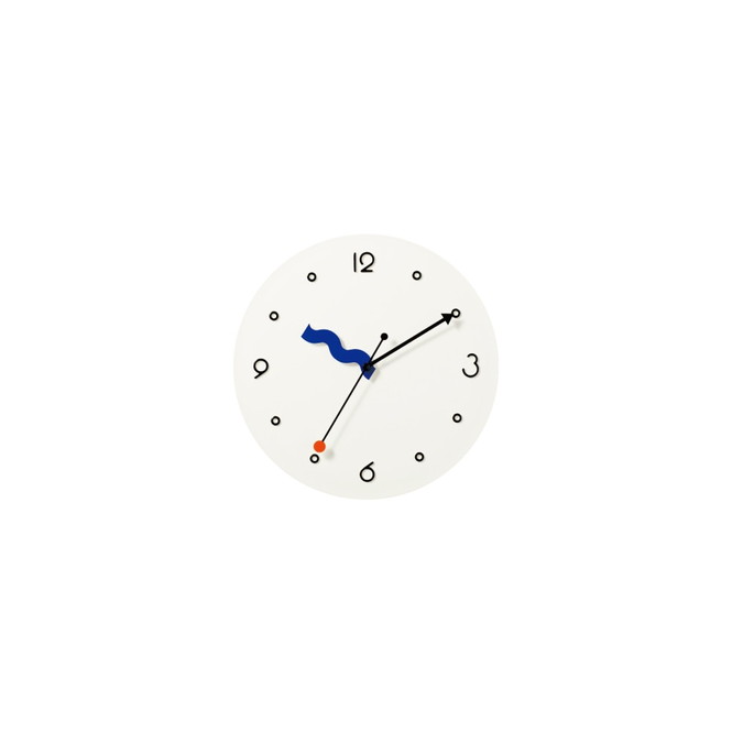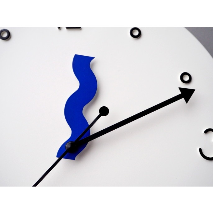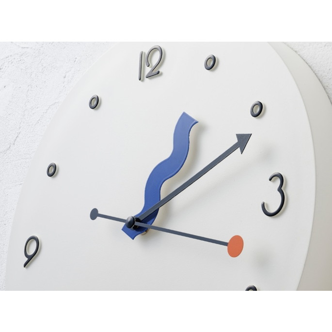 なみなみさせた短針、矢印を模った長針、点と点を結ぶ秒針。それぞれが自由で個性があり、重なり合う姿も面白い。「楽しい!」を表現した、ポストモダンを連想させるプレイフルデザインです。数字はポップで丸みを帯びたフォントになるよう手書きで制作しました。インデックスは白抜きの〇にして抜け感のバランスを意識しています。