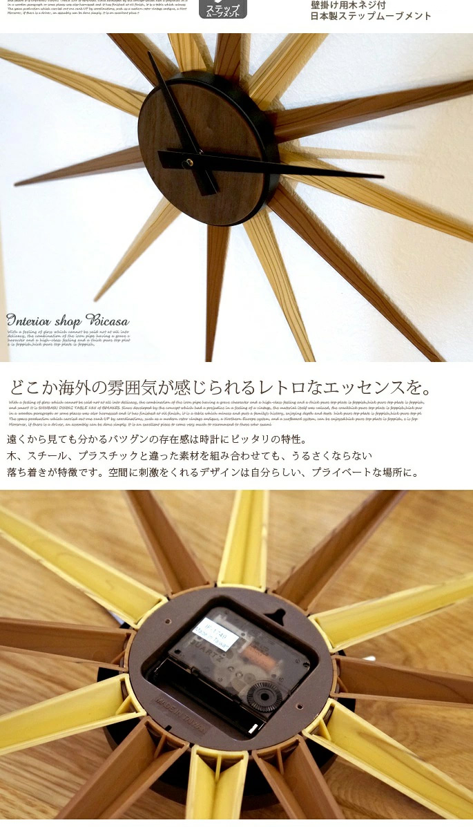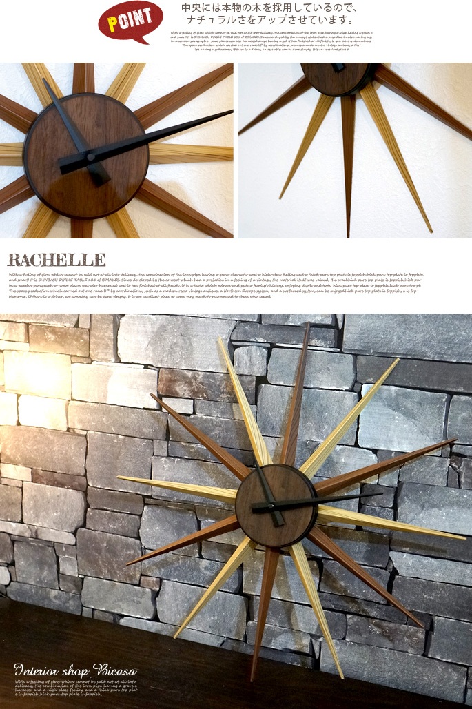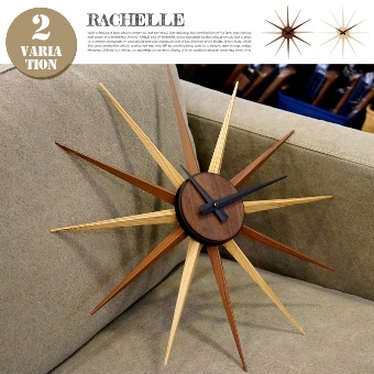 放射状に伸びた12本のアームと、木目調のカラーリングが目を引くオブジェにも負けない存在感のあるRachelle(ラシェル)掛時計。邪魔にならないインパクトを壁際で発揮してくれます。モダンな空間から、ナチュラルテイストまで幅広くフィットする不思議なデザイン!構造はとてもシンプル。時計の針を動かす心臓部(ムーブメント)部は、単3電池x1で動きます。アーム部分はプラスチック製なので軽量で気軽に飾れるのもうれしいポイント。