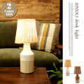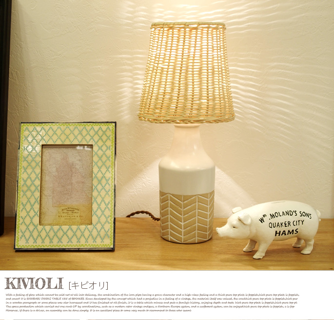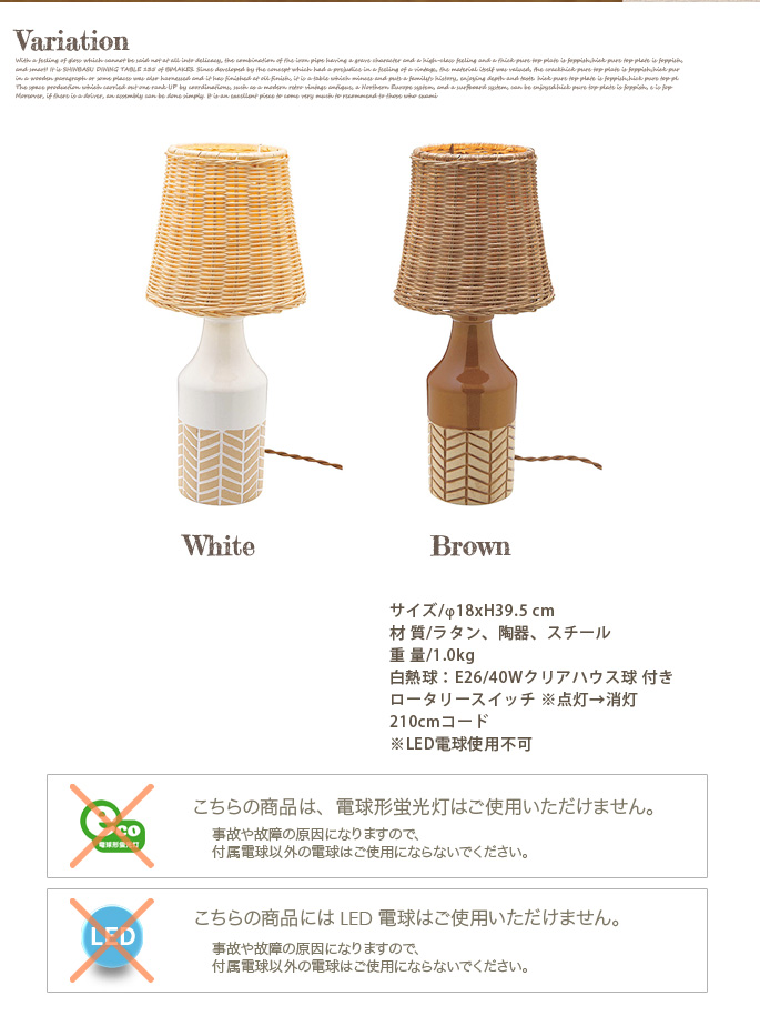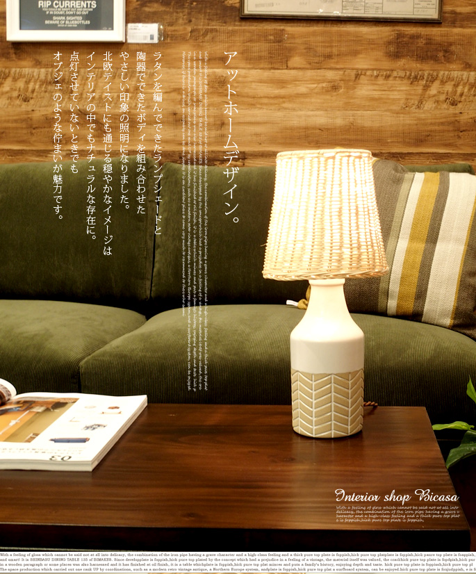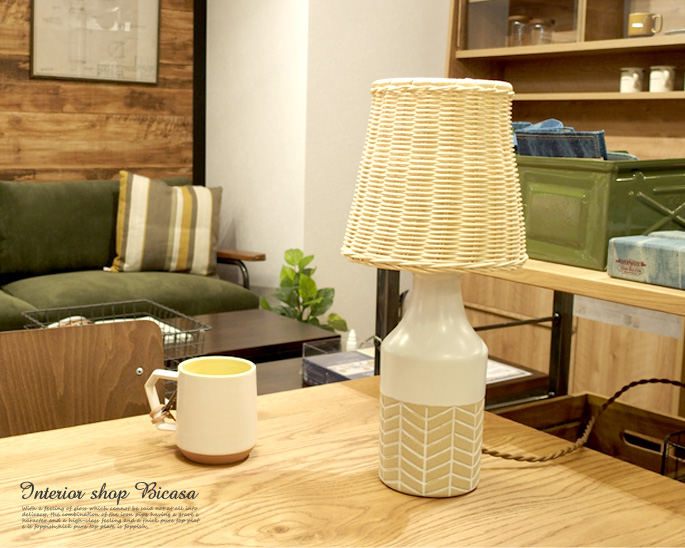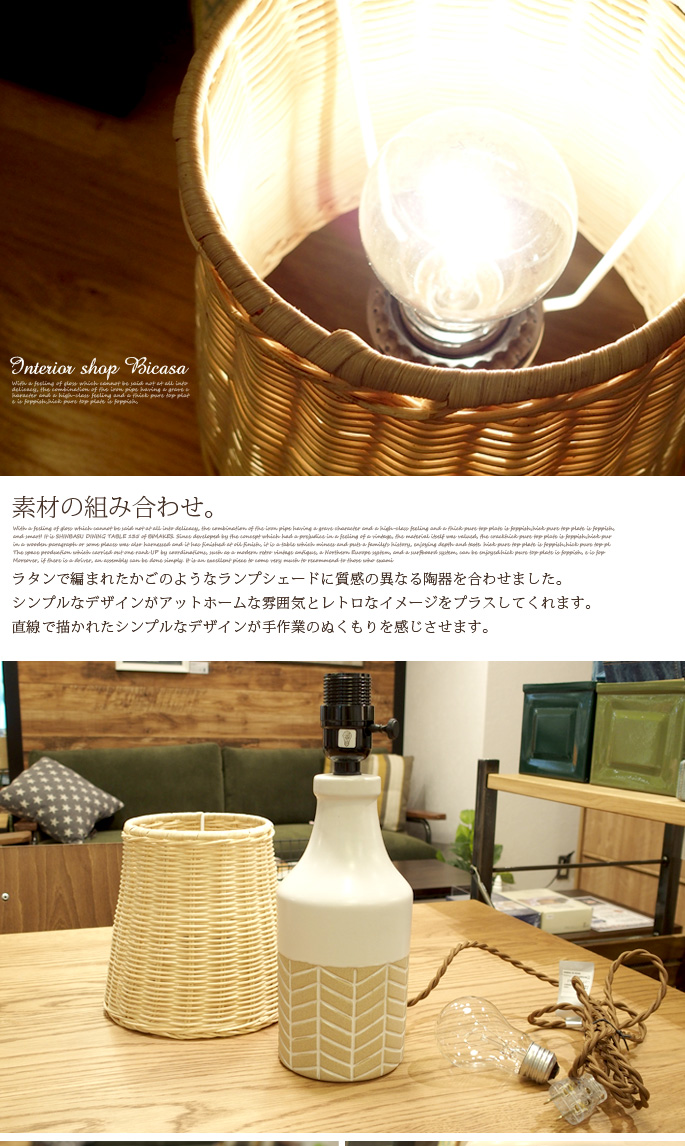 ラタンを編んでできたランプシェードと陶器でできたボディを組み合わせたやさしい印象の照明です。北欧テイストにも通じる穏やかなイメージはインテリアの中でもナチュラルな存在に。点灯させていないときでもオブジェのような佇まいが魅力です。本体の首もとのスイッチを回すと点灯と消灯の切り替えができます。筒状のセードなので、点灯させたときに上下方向だけでなく、網目の隙間からも光が漏れ周りに広がる影も魅力のひとつです。。
