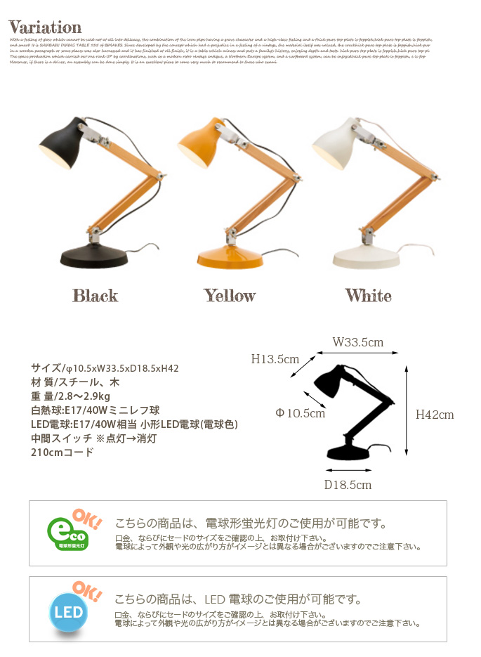 定番のフォルムながら素材を組み合わせることで、やさしい印象の照明になりました。北欧テイストにも通じる穏やかなイメージはインテリアの中でもナチュラルな存在に。アーム部分を木製にすることで生まれたオシャレなコントラストが魅力です。アームを2本並べたりジョイント部分のネジや金具をあえて剥き出しにしたりどこかファクトリーな雰囲気が感じられる仕上がりを目指しました。定番のモノトーンにトーンを落としたイエローを加えた合計3色をご用意しました。