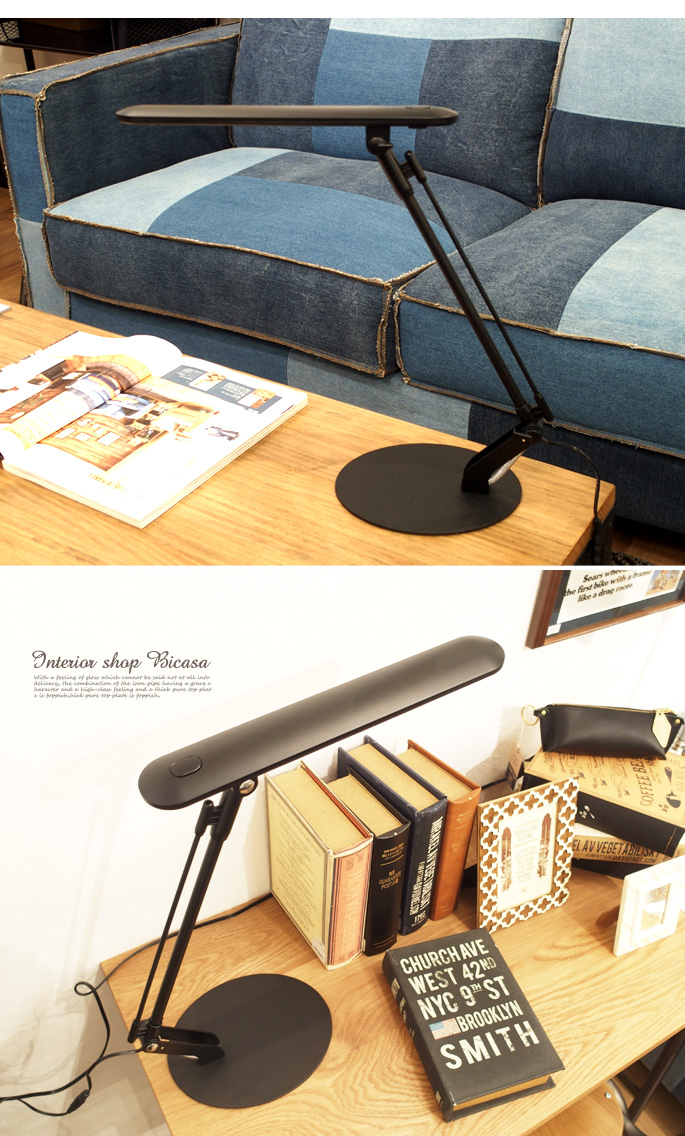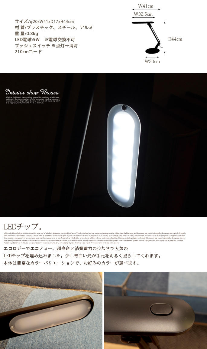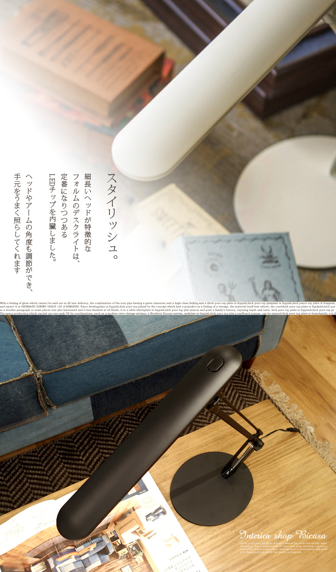 細長いヘッドが特徴的なフォルムのデスクライトは、定番になりつつあるLEDチップを内臓しました。ヘッドやアームの角度も調節ができ、手元をうまく照らしてくれます。5色の豊富なカラーもセールスポイント!選ぶ楽しみが増えます。スイッチはヘッドの端にあるプッシュスイッチでワンタッチでON/OFFの切り替えができます。