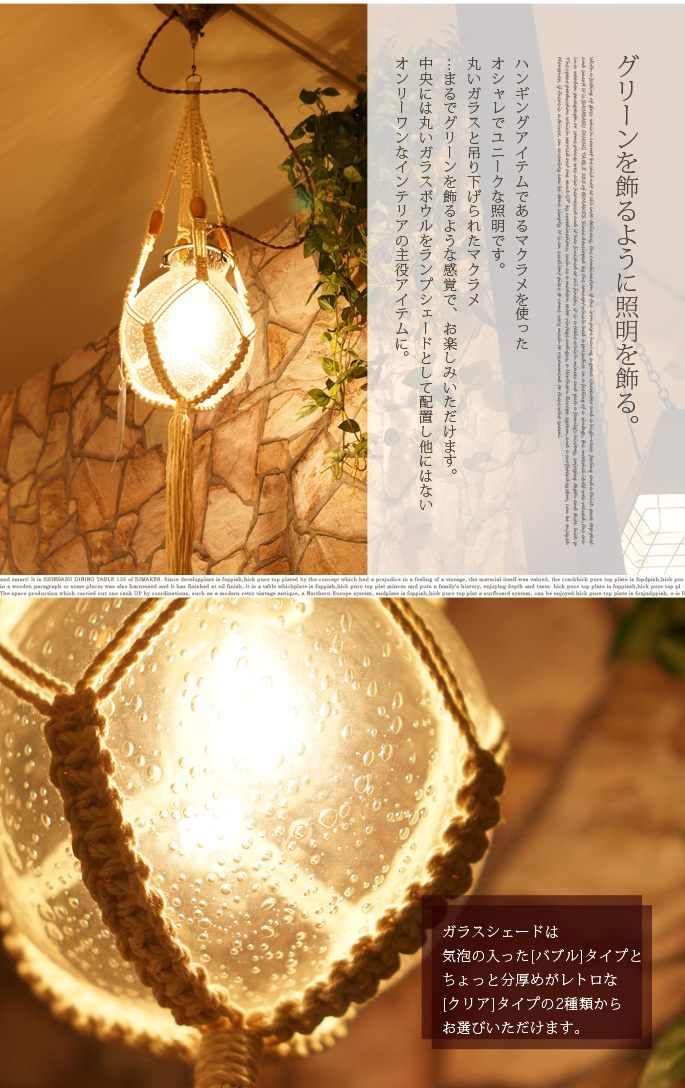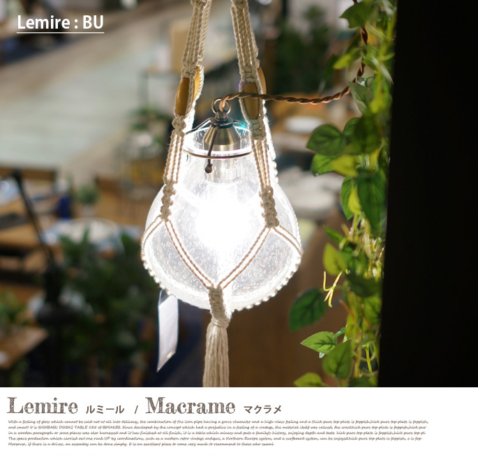 インターフォルム(INTERFORM)のLemire(ルミール)はグリーンを飾るような感覚で照明演出ができるフォルムが魅力の天井照明です。観葉植物を吊るすマクラメとレトロガラスを融合したデザインがレトロ・ビンテージテイストの雰囲気を感じさせるので、リビングだけでなく、ダイニングや寝室など、どんな空間にもフィットします。セードがクリア・バルブの2タイプから選べる他、用途に合わせて電球有、無が選べるようになっております。マクラメのみでの販売も行っています。