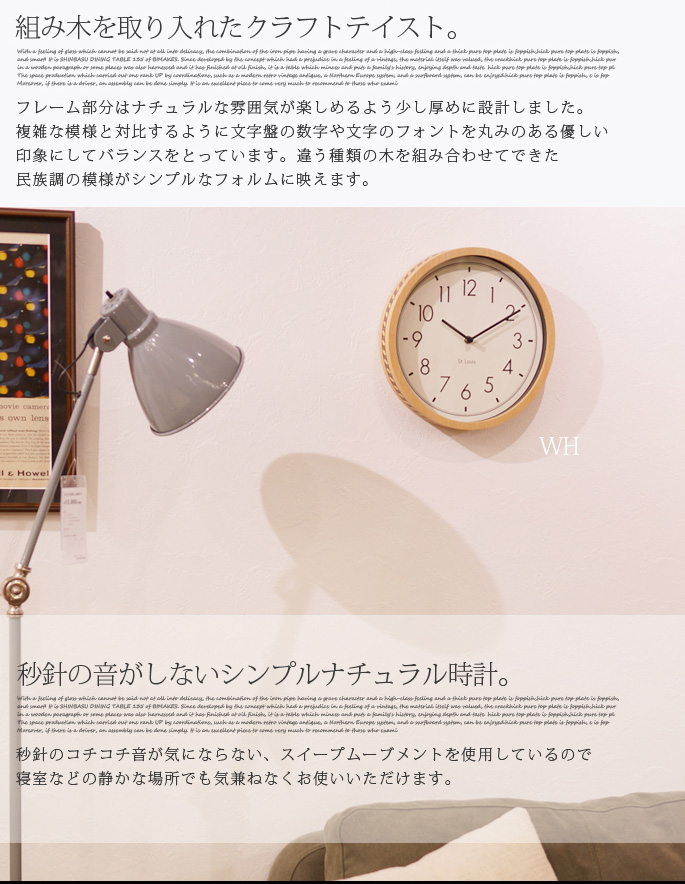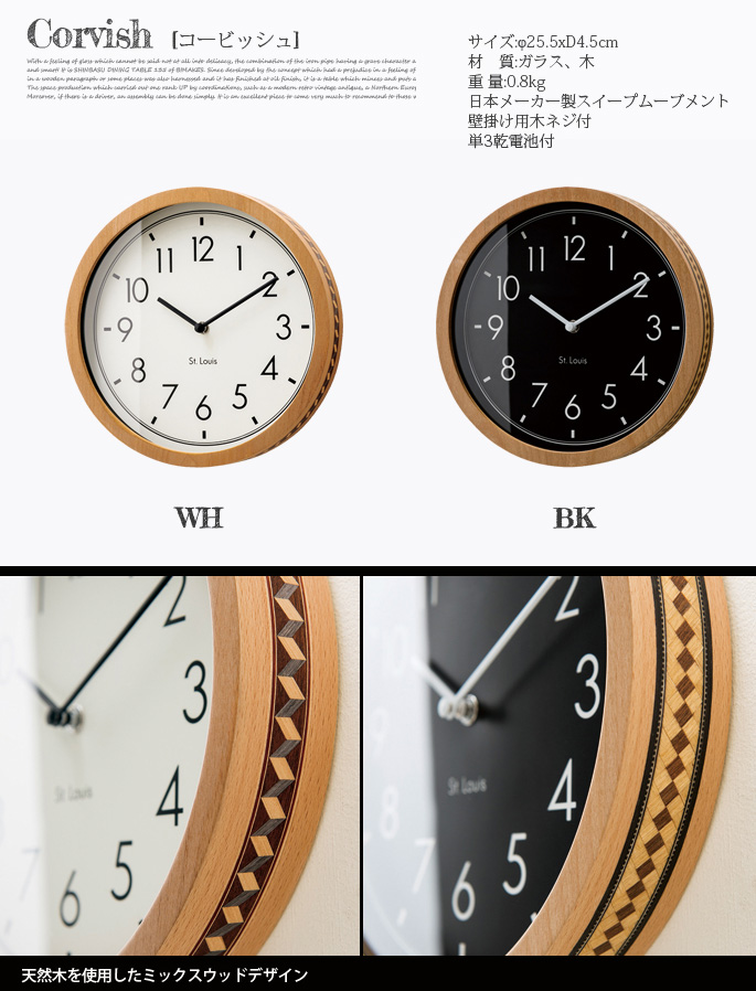 インターフォルム(INTERFORM)のCorvish(コービッシュ)はフレーム側面に見られる寄せ木細工のような模様が魅力の掛け時計です。ナチュラルな雰囲気に加わったクラフトテイストがレトロ・ビンテージテイストの雰囲気を感じさせるので、リビングだけでなく、ダイニングや寝室など、どんな空間にもフィットします。カラーがホワイト・ブラックの2色から選べるようになっております。