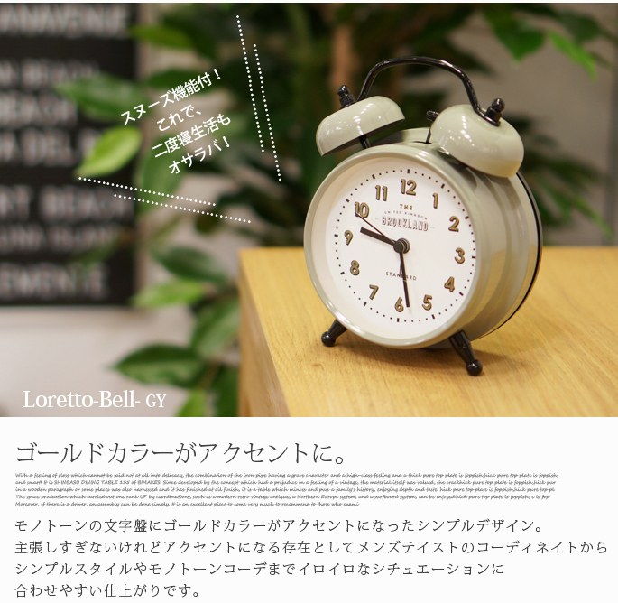 インターフォルム(INTERFORM)のLoretto Bell(ロレト ベル)はショップやカフェを思わせるゴールドカラーの箔押し文字が魅力の置時計です。シンプルなフレームと相性の良い数字を強調した文字盤がレトロ・ビンテージテイストの雰囲気を感じさせるので、リビングだけでなく、ダイニングや寝室など、どんな空間にもフィットします。カラーがグレー・ブラック・クロームの3色から選べるようになっております。