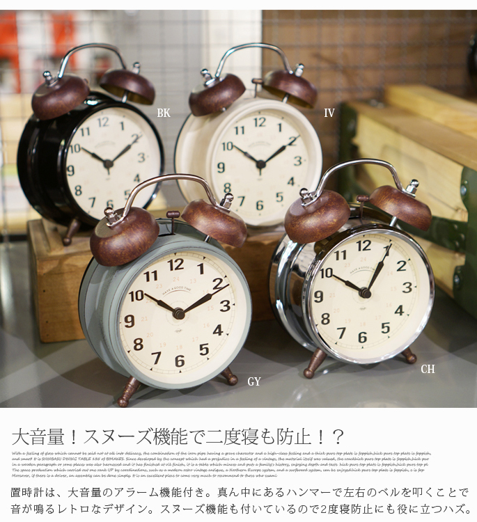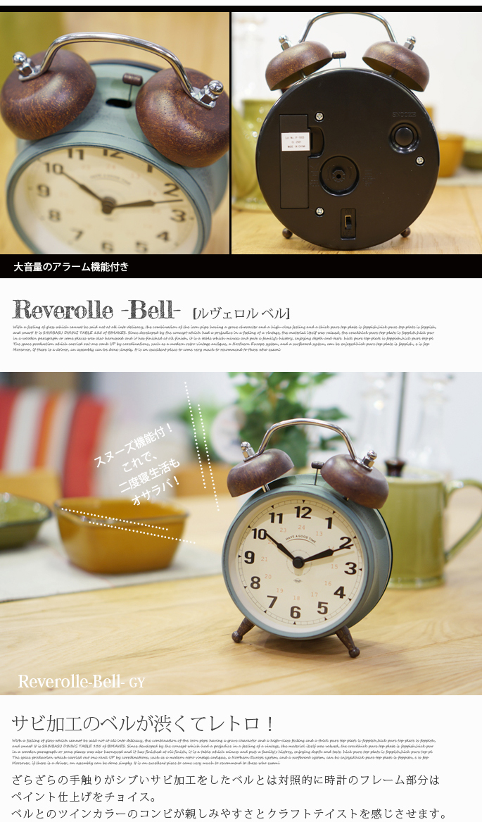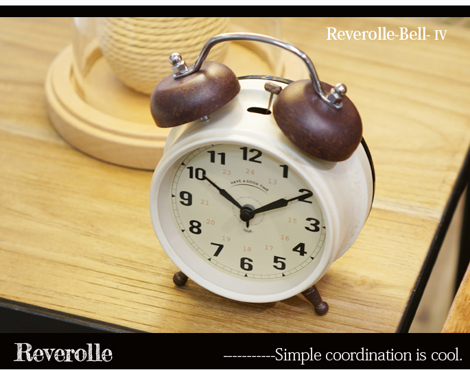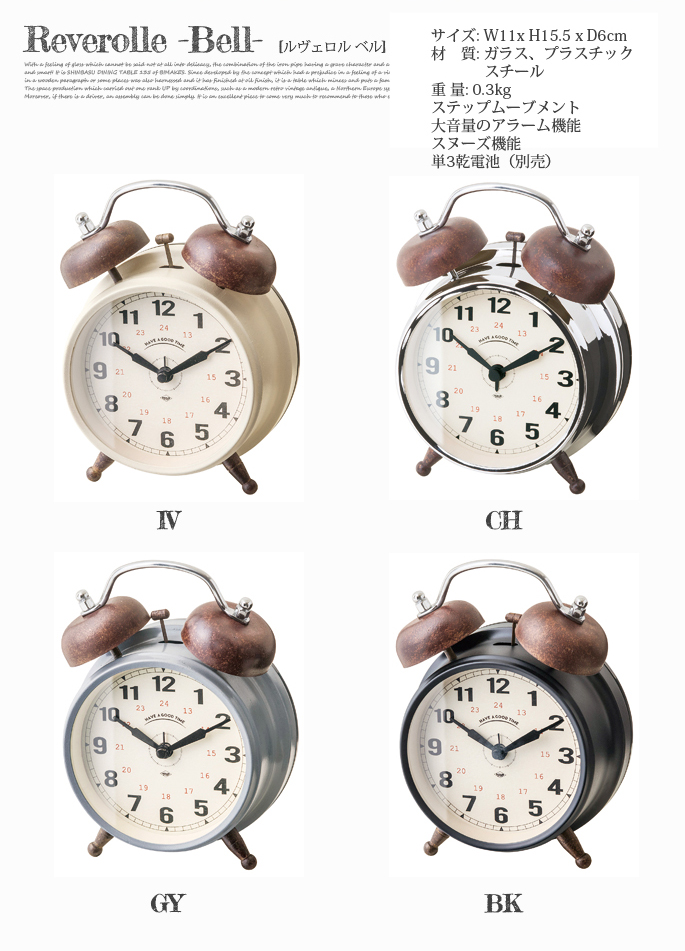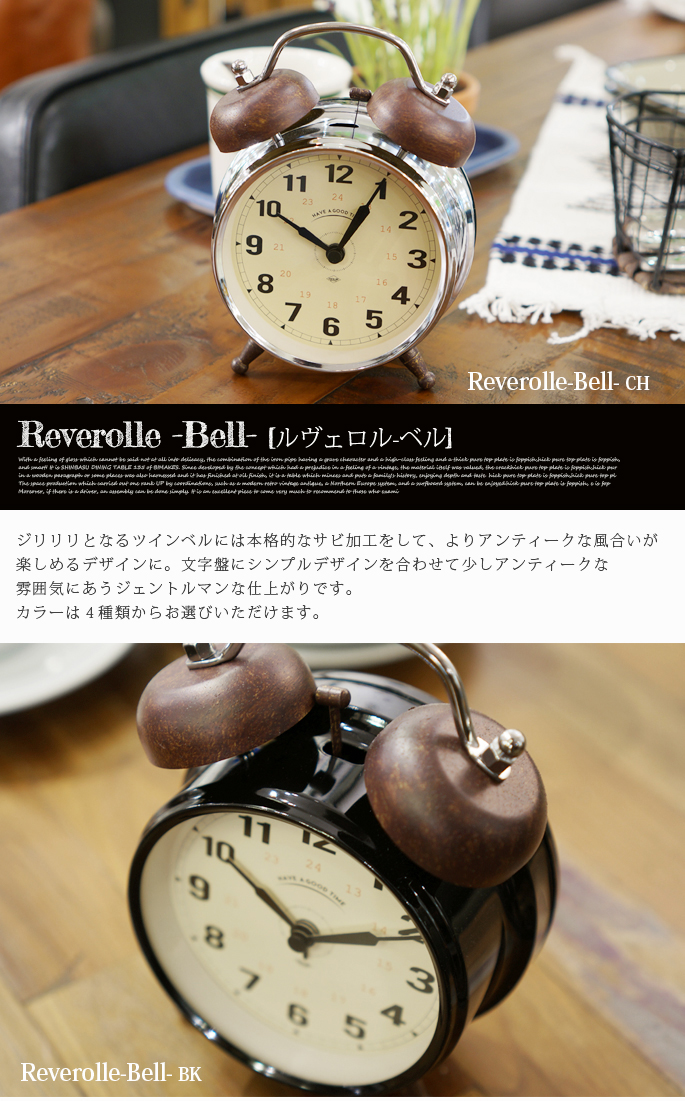 インターフォルム(INTERFORM)のReverolle Bell(ルヴェロル ベル)はペイント仕上げの文字盤とサビ加工を施したツインベルが魅力の置時計です。クラッシックな雰囲気を醸し出すフレームデザインと針がレトロ・ビンテージテイストの雰囲気を感じさせるので、リビングだけでなく、ダイニングや寝室など、どんな空間にもフィットします。カラーがグレー・ブラック・クローム・アイボリーの4色から選べるようになっております。
