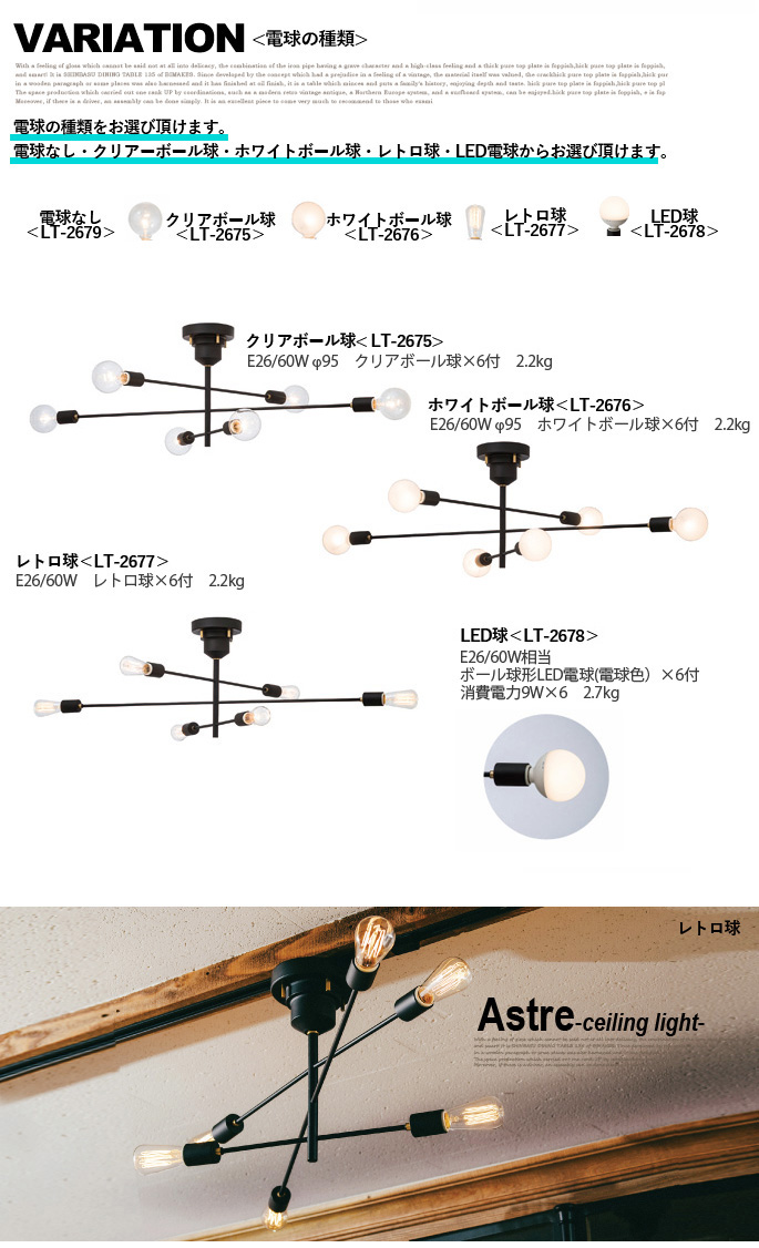 シンプルで機能的なアクセサリー照明。6灯の多灯タイプでシェードを省いたソリッドデザイン。電球の形状や照度・フィラメントでイメージは大きく異なり、お部屋のコンセプトに合わせてコーディネートがお楽しみいただけます。セットの電球は勿論、エジソン電球・LED SWAN BULBとの組合せもおすすめです。アームはそれぞれ340°回転。傾斜天井取付不可。クラシカルからモダンまで幅広く対応可能です。