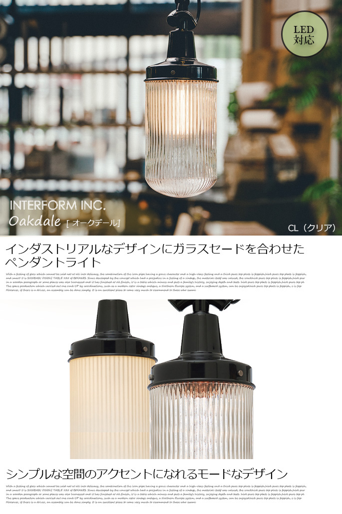 Oakdale(オークデール)LT-3387は、無骨なデザインのソケットと相性のよいストライプ加工のガラスが光に表情をくれるクールな幅125mm、奥行き125mm、高さ340mmのペンダントライトクです。ストライプの凹凸が表情豊かな光を広げ、空間のアクセントとなります。ガラスのカラーは定番のクリアとホワイトの2種類からお選びいただけて、電球はお手持ちの電球やお好みの電球で楽しめる電球なしタイプ、昔ながらの白熱電球、フィラメントが美しいレトロ電球、省エネかつ長寿命のLED電球の4種類からお選びいただけます。