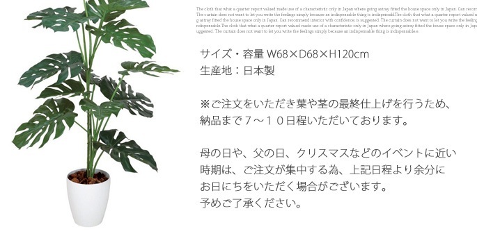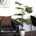 人気のモンステラでおしゃれな空間に! イミテーショングリーン モンステラ120は蛍光灯の光にも反応する可視光応答型の光触媒をしようした人工観葉植物で、枯れることなく長期間安定して光触媒機能を発揮するいやしアイテムです。人は緑の植物を見るとやすらぎを感じると言われているので、お部屋にイミテーショングリーンを置くとこでより一層安らげる空間を生み出します。また、ヴィンテージテイストやレトロな雰囲気、北欧モダンなどの空間アクセントにもぴったりです。 |