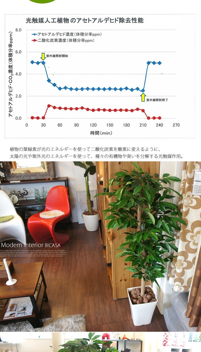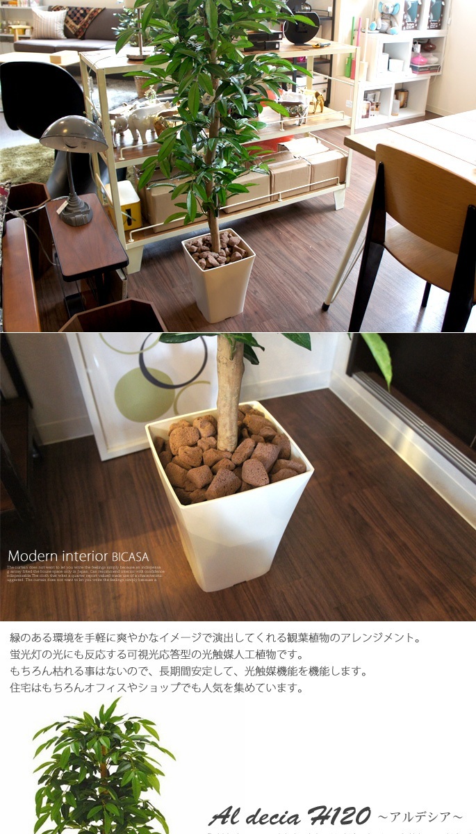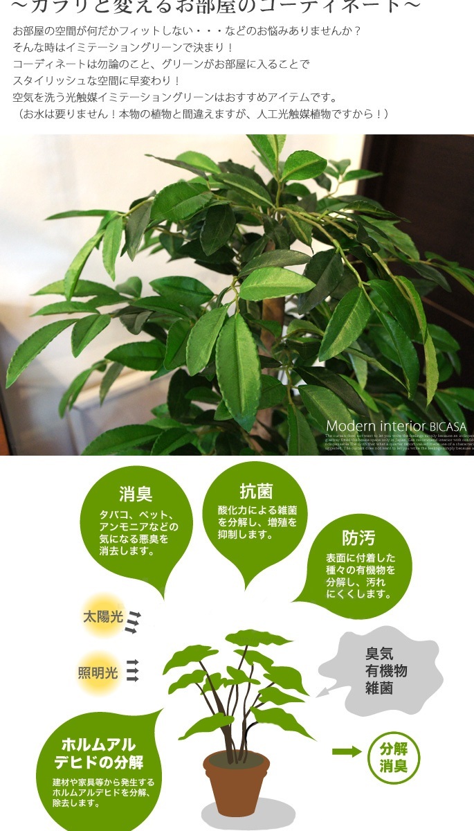 空間に癒しとアクセントとなるイミテーショングリーン(人口植物)【アルデシア120】です。新緑を感じさせてくれる濃淡のあるグリーンカラーが元気と存在感を空間に与えてくれて、空間にワンポイントの癒し空間を作ることができます。「光の楽園」の酸化チタン光触媒でクリーンな環境を維持し、観葉植物が持つリラックス効果をさらに高めてくれる商品です。アルデシアはどのようなテイストの空間でもコーディネートしやすく、リビング空間、玄関、寝室、オフィス空間まで幅広く利用可能です。 ホルムアルデヒト分解・消臭・抗菌・防汚効果の高い逸品です!