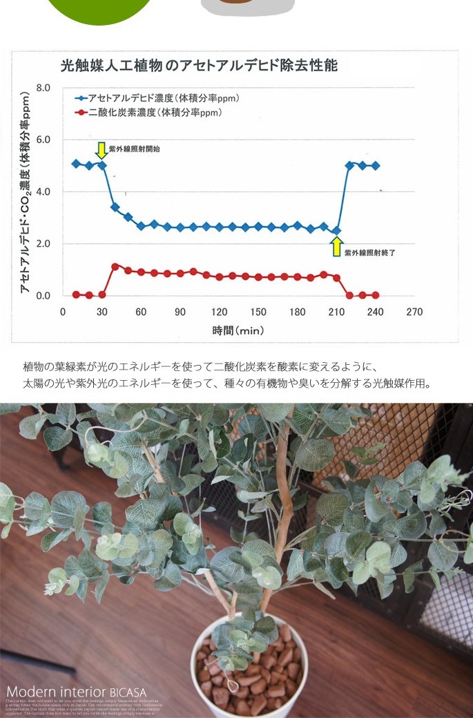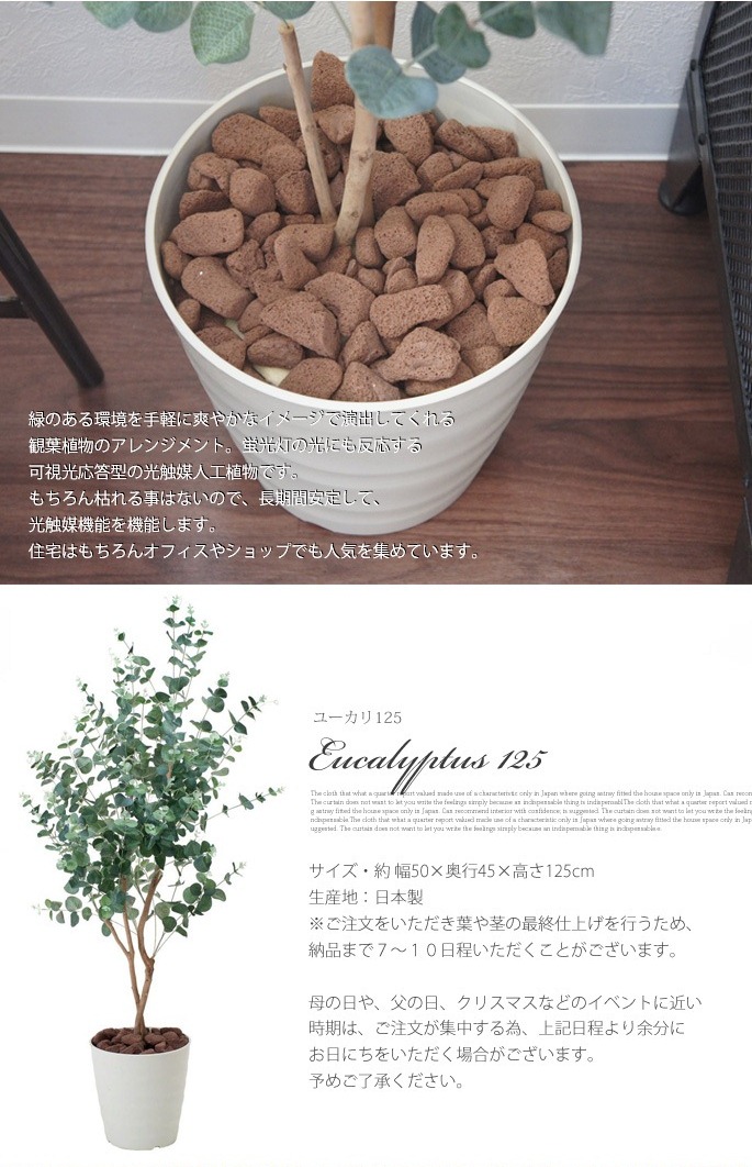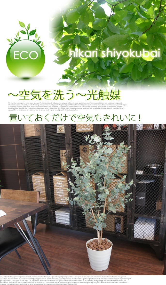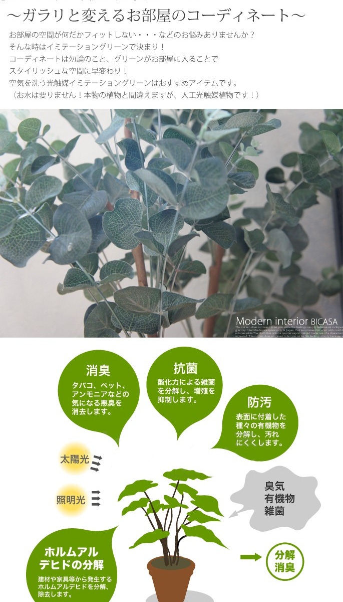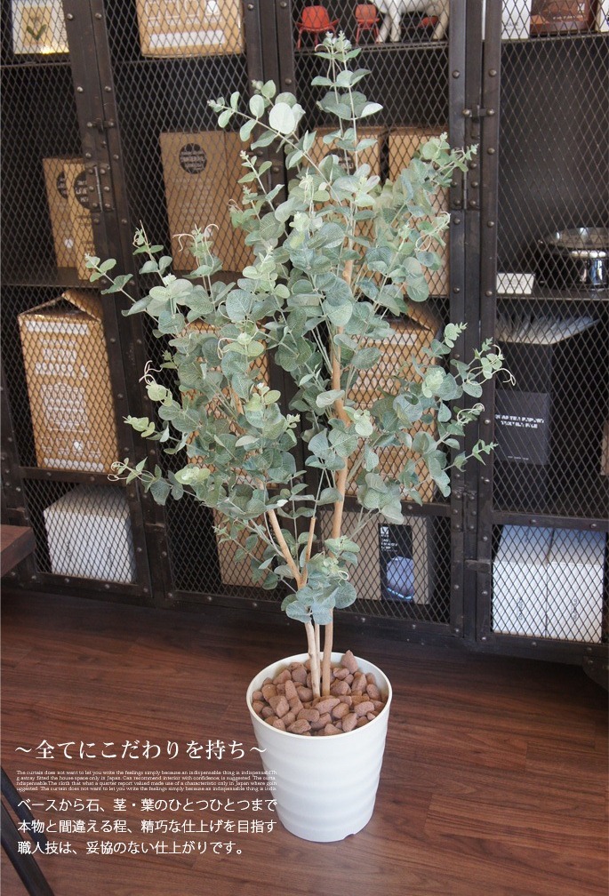 空間に癒しを与えてくれるイミテーショングリーン ユーカリ125(Eucalyptus)は、シルバーのまあるい葉っぱが可愛く印象的な観葉植物です。シルバーリーフ植物の人気と共に注目度もUPしており、お部屋のアクセントと使用するのにぴったりなサイズで、リビングや寝室、書斎の他、オフィスや店舗などの使用にもおすすめです。防汚・抗菌・消臭効果を発揮する酸化チタン光触媒仕となっていますので、クリーンな環境を維持し、観葉植物が持つリラックス効果をさらに高めてくれます。