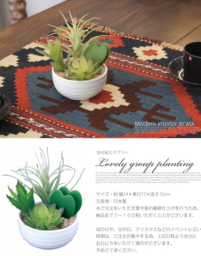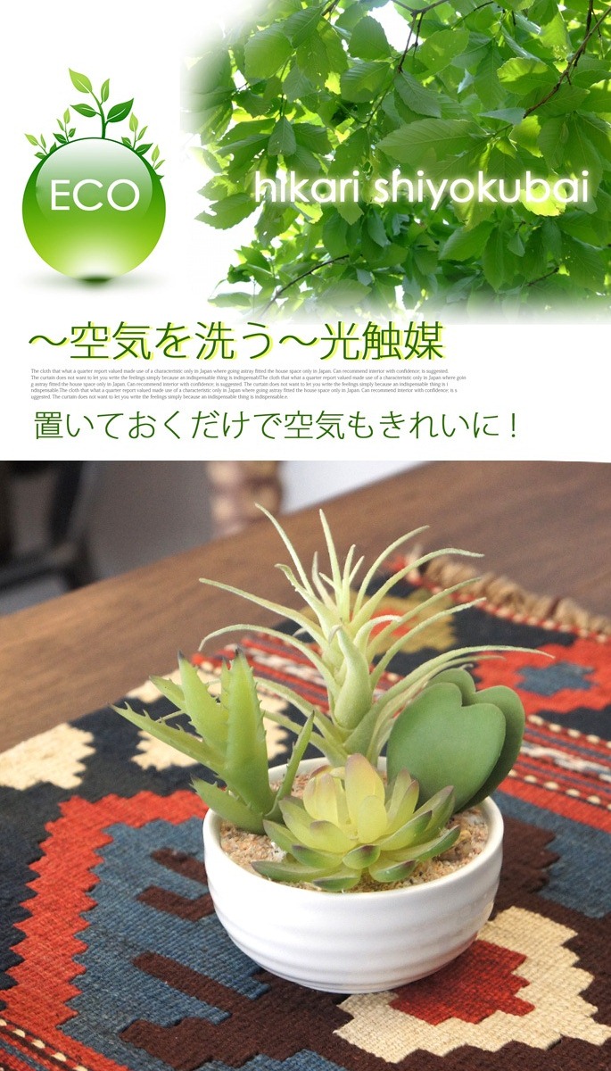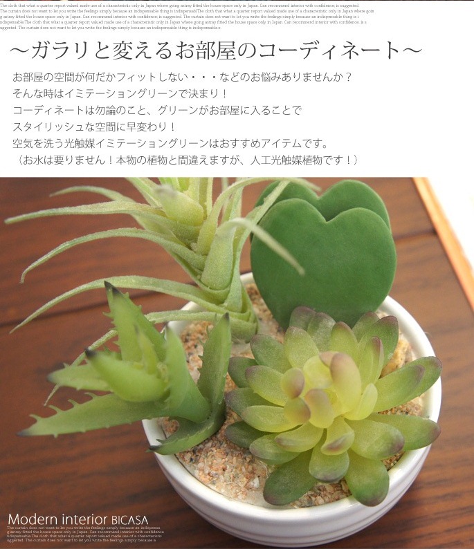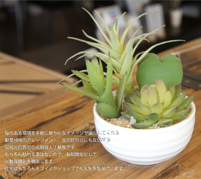空間に癒しを与えてくれるイミテーショングリーン 寄せ植えラブリーは、その名のとおり、かわいらしい形で厚みのある葉が印象的でどんな空間にもさりげなく飾れる人工植物です。お部屋のアクセントと使用するのにぴったりなサイズで、リビングや寝室、書斎、化粧室、サニタリールーム他、オフィスや店舗などの利用にもおすすめです。防汚・抗菌・消臭効果を発揮する酸化チタン光触媒仕となっていますので、クリーンな環境を維持し、観葉植物が持つリラックス効果をさらに高めてくれます。
