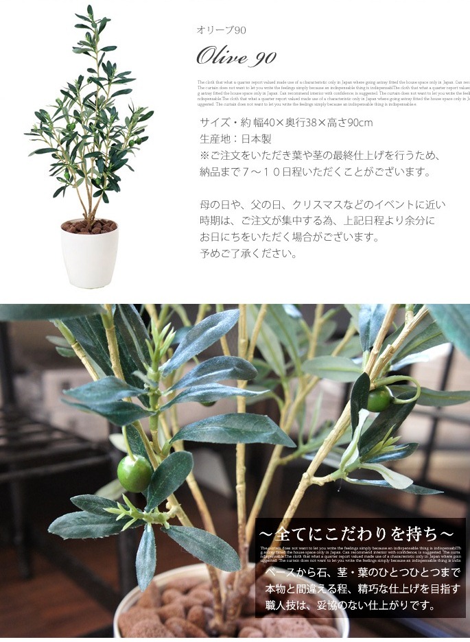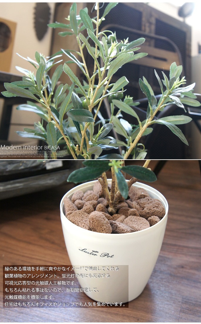空間に癒しを与えてくれるイミテーショングリーン オリーブ90はオリーブの実が絶妙なアクセントを加える人工植物です。お部屋のアクセントと使用するのにぴったりなサイズで、リビングや寝室、書斎の他、オフィスや店舗などの使用にもおすすめです。防汚・抗菌・消臭効果を発揮する酸化チタン光触媒仕となっていますので、クリーンな環境を維持し、観葉植物が持つリラックス効果をさらに高めてくれます。