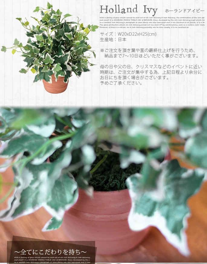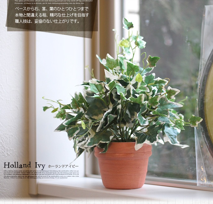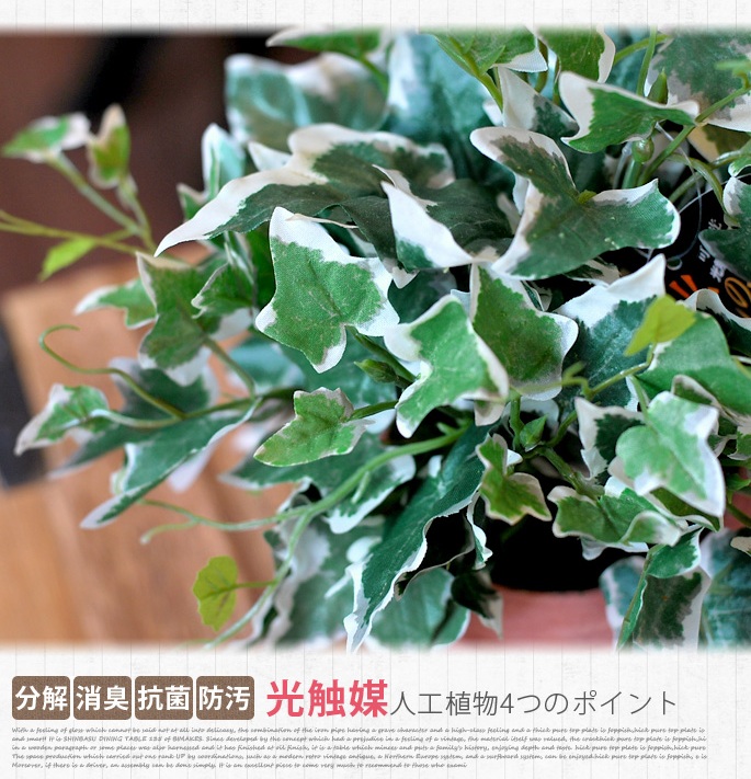 ナチュラルカラーのポットとグリーングラデーションが癒しを与えてくれるイミテーショングリーン ホーランドアイビーは、どんな場所にも置けるコンパクトサイズが魅力の人工植物です。お部屋のアクセントとして使用するのにぴったりなサイズで、リビングや寝室、書斎の他、オフィスや店舗などの使用にもおすすめです。防汚・抗菌・消臭効果を発揮する酸化チタン光触媒仕となっていますので、クリーンな環境を維持し、観葉植物が持つリラックス効果をさらに高めてくれます。