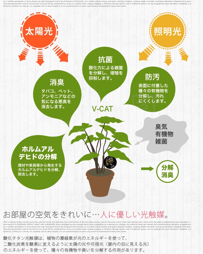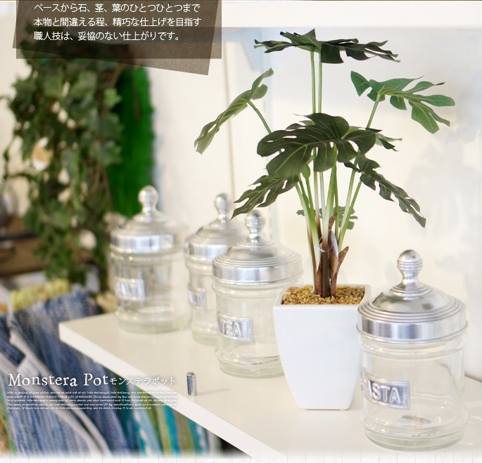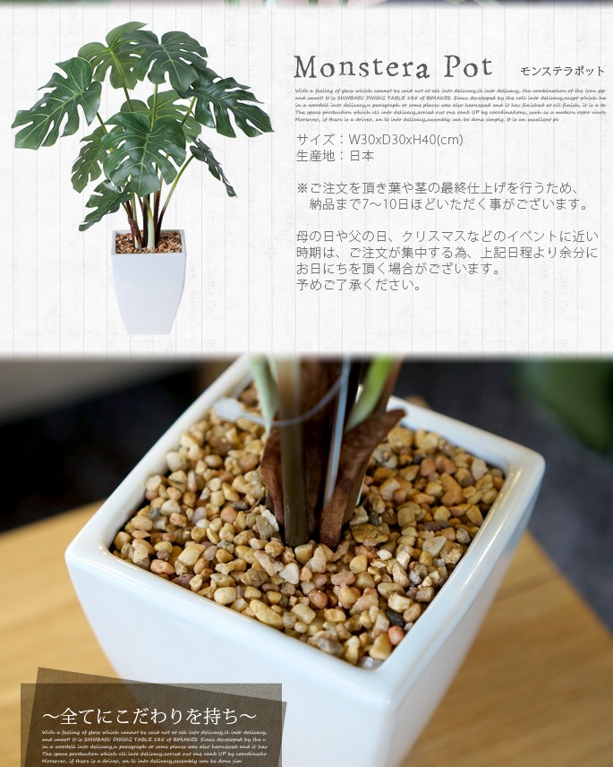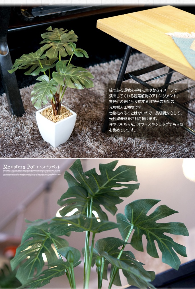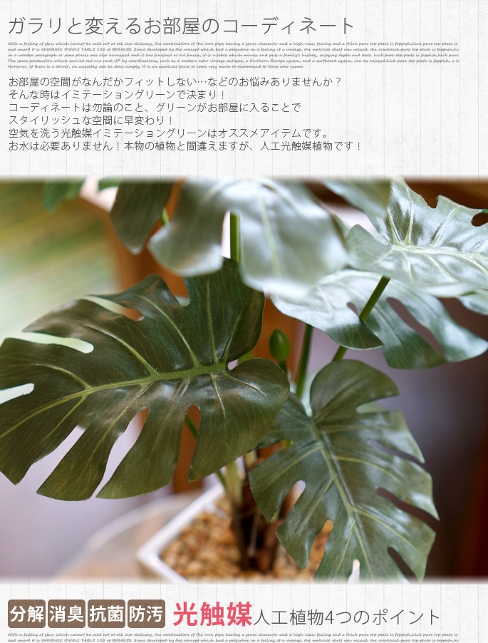 葉・茎の質感が本物同様の安らぎを与えてくれるイミテーショングリーン モンテスラポットは、どんな場所にも置けるコンパクトサイズが魅力の人工植物です。お部屋のアクセントとして使用するのにぴったりなサイズで、リビングや寝室、書斎の他、オフィスや店舗などの使用にもおすすめです。防汚・抗菌・消臭効果を発揮する酸化チタン光触媒仕となっていますので、クリーンな環境を維持し、観葉植物が持つリラックス効果をさらに高めてくれます。