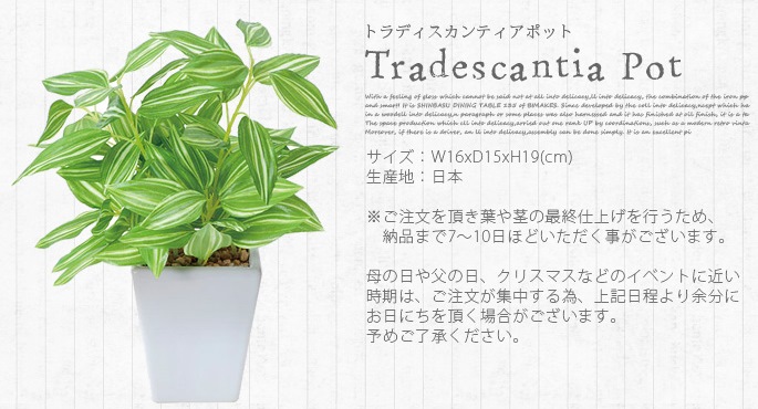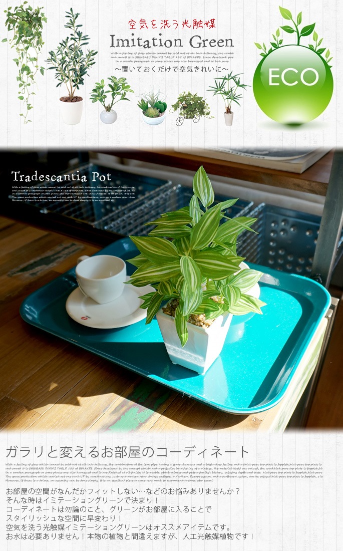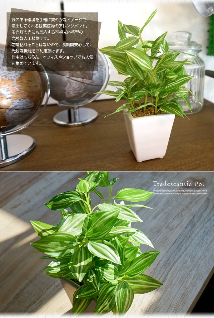 クリーンなイメージのセラミックポットと爽やかなライトグリーンが癒しを与えてくれるイミテーショングリーン トラディスカンティアポットは、どんな場所にも置けるコンパクトサイズが魅力の人工植物です。お部屋のアクセントとして使用するのにぴったりなサイズで、リビングや寝室、書斎の他、オフィスや店舗などの使用にもおすすめです。防汚・抗菌・消臭効果を発揮する酸化チタン光触媒仕となっていますので、クリーンな環境を維持し、観葉植物が持つリラックス効果をさらに高めてくれます。