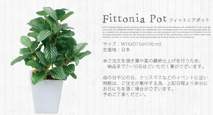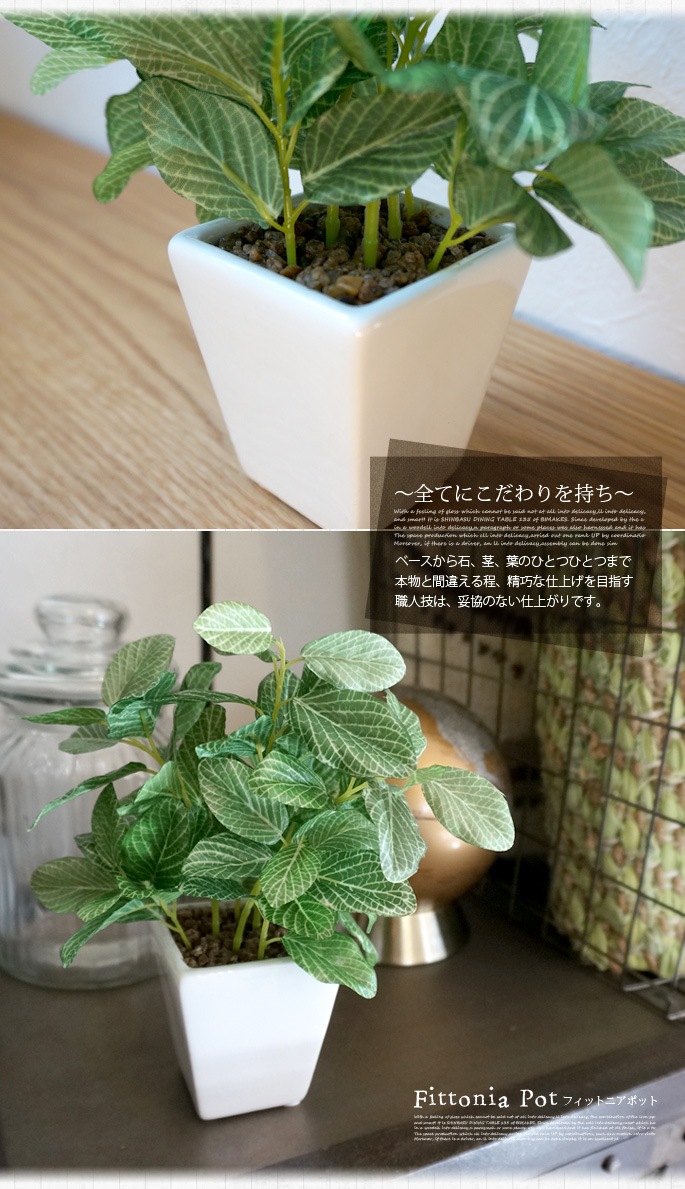 クリーンなイメージのセラミックポットと爽やかなライトグリーンが癒しを与えてくれるイミテーショングリーン フィットニアポットは、どんな場所にも置けるコンパクトサイズが魅力の人工植物です。お部屋のアクセントとして使用するのにぴったりなサイズで、リビングや寝室、書斎の他、オフィスや店舗などの使用にもおすすめです。防汚・抗菌・消臭効果を発揮する酸化チタン光触媒仕となっていますので、クリーンな環境を維持し、観葉植物が持つリラックス効果をさらに高めてくれます。
