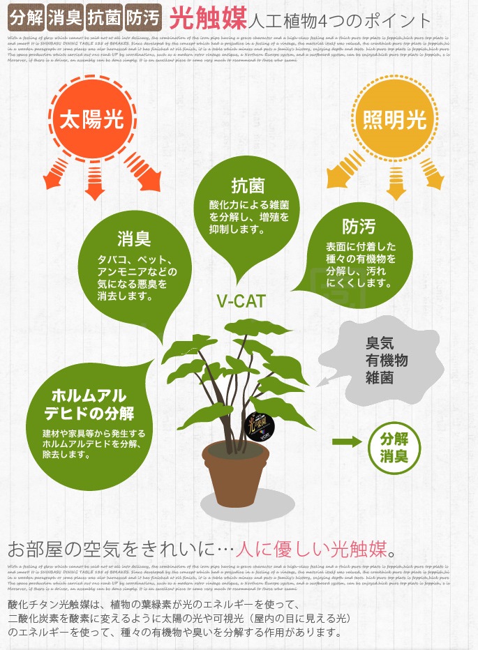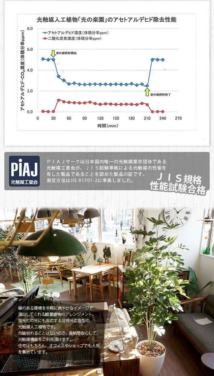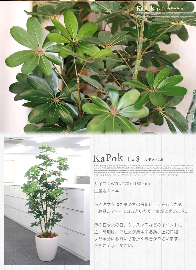 イミテーショングリーンカポック1.8は蛍光灯の光にも反応する可視光応答型の光触媒を使用した人工観葉植物で、枯れることなく長期間安定して光触媒機能を発揮するいやしアイテムです。リビングやエントランス、寝室や書斎、オフィス等の空間にコーディネイトしていただければ天井を高く見せ、より一層ランクUPしたインテリア空間を演出してくれます。北欧モダン、ナチュラルテイスト、ヴィンテージやレトロな雰囲気など、どんな空間にも合わせやすいプロダクトで実物をご覧頂いてもベースから石、茎、葉のひとつひとつまで本物と未間違えてしまうほどの精巧さがあります。
