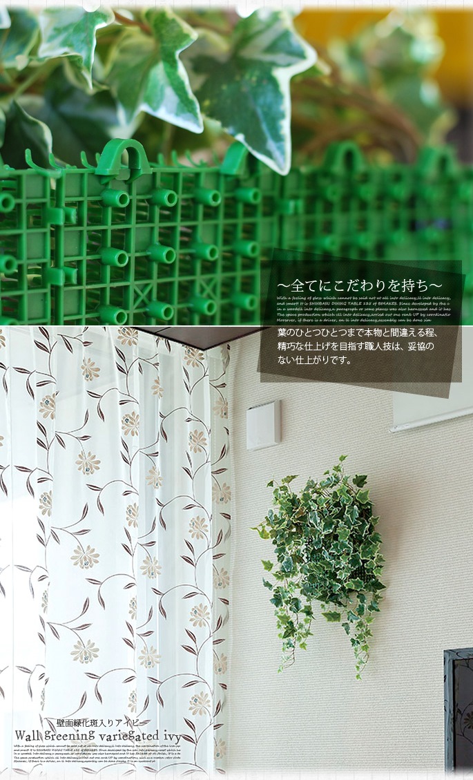 イミテーショングリーンの新しいスタイル!壁面緑化タイプのプロダクト、壁面緑化斑入りアイビーです。爽やかなライトグリーンが癒しを与えお部屋のアクセントとしておすすめの逸品です。リビングや寝室、書斎の他、オフィスや店舗など空間を選ばずコーディネイトが可能です。防汚・抗菌・消臭効果を発揮する酸化チタン光触媒仕となっていますので、クリーンな環境を維持し、観葉植物が持つリラックス効果をさらに高めてくれます。上部と向って右側の端に繋ぎ合わせてご利用いただける受けがついておりますので、同シリーズをもう一枚足してご利用いただく事も可能でお好みの枚数を付け足すことが出来ます。