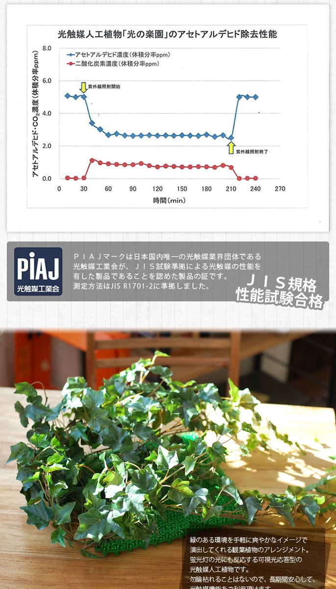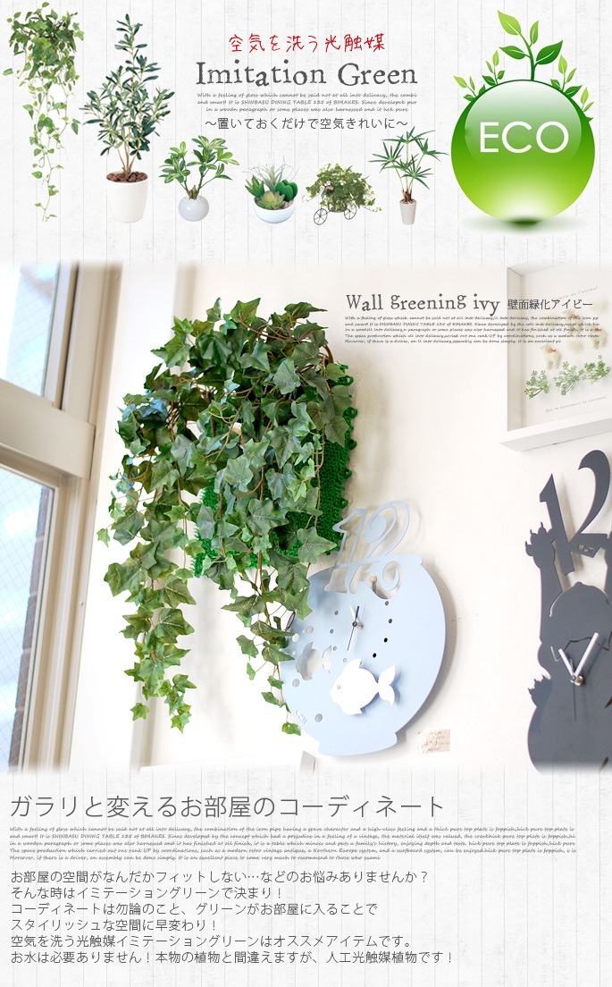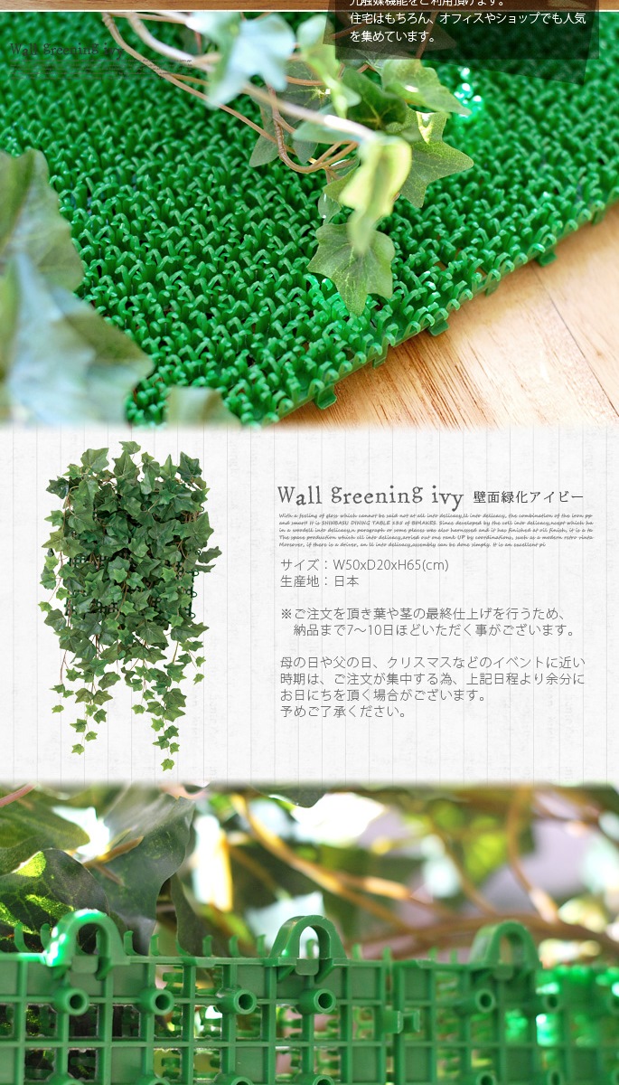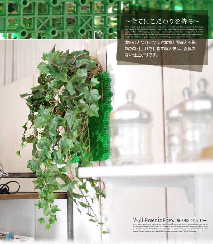 まるで本物の葉っぱのような表情と質感を楽しめる壁面緑化アイビーです。瑞々しい深みのあるグリーンが癒しを与えてくれるイミテーショングリーンで約50~60cm四方のコンパクトサイズが魅力の人工植物です。お部屋のアクセントとして使用するのにぴったりなサイズで、リビングや寝室、書斎の他、オフィスや店舗などの使用にもおすすめです。防汚・抗菌・消臭効果を発揮する酸化チタン光触媒仕となっていますので、クリーンな環境を維持し、観葉植物が持つリラックス効果をさらに高めてくれます。上部と向って右側の端に繋ぎ合わせてご利用いただける受けがついておりますので、同シリーズをもう一枚足してご利用いただく事も可能でお好みの枚数を付け足すことが出来ます。