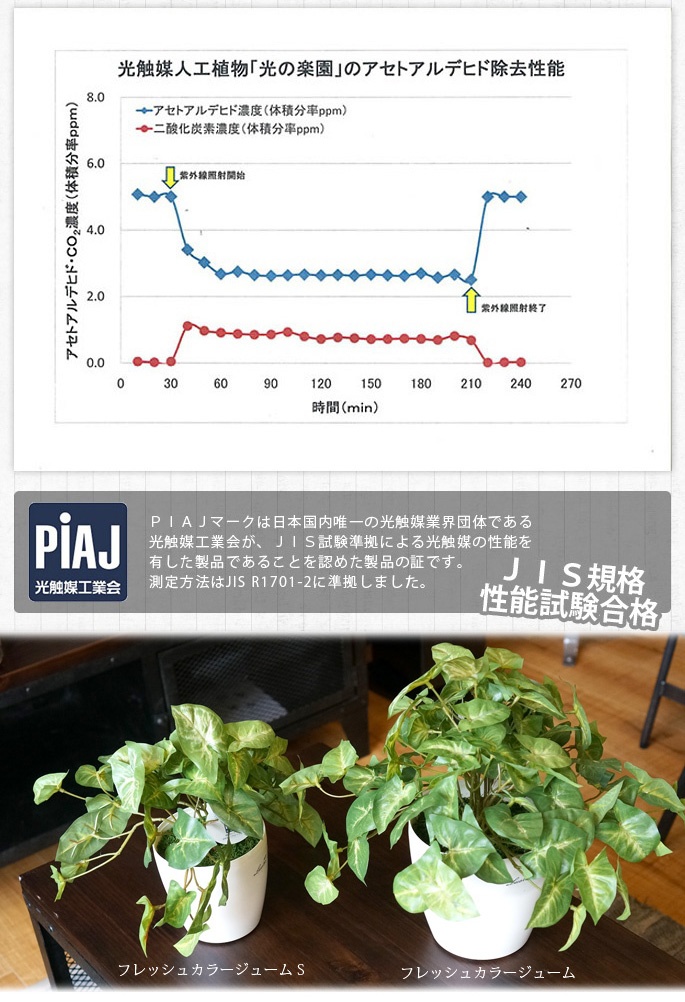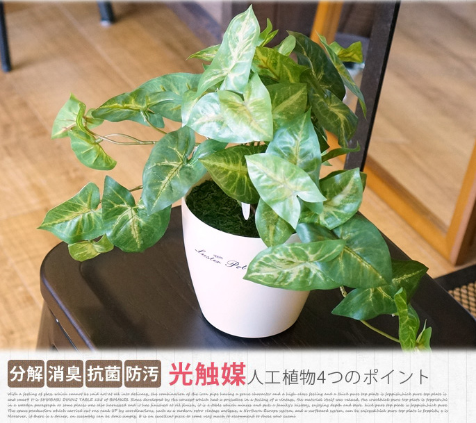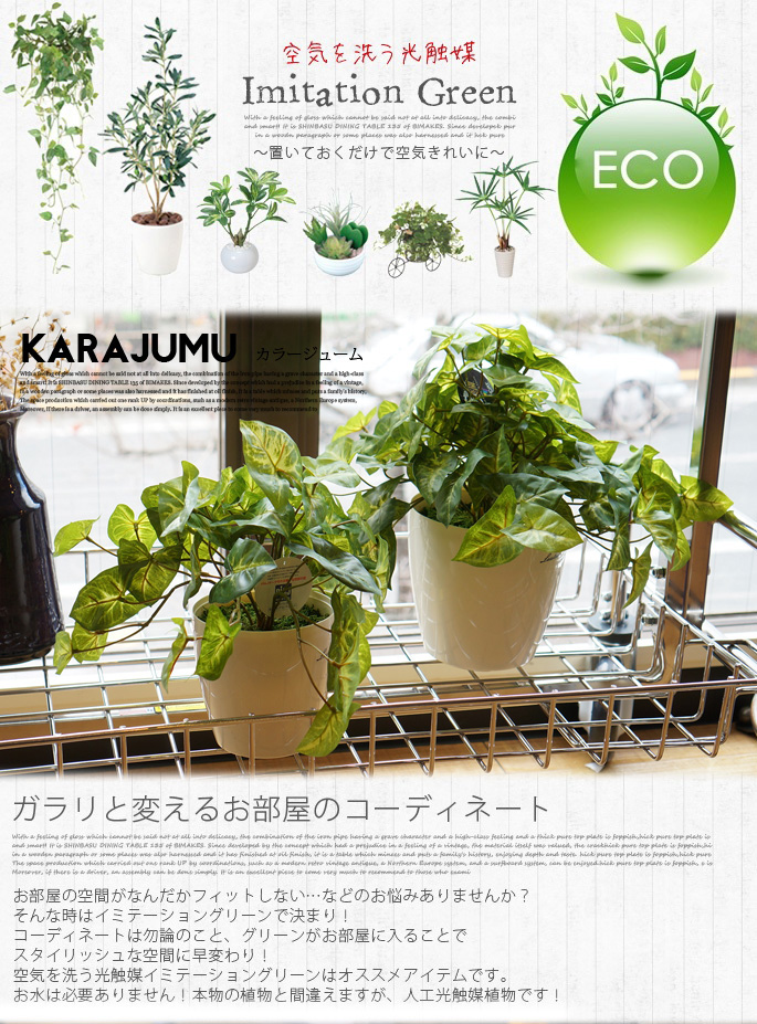 イミテーショングリーン光触媒シリーズは、蛍光灯の光にも反応する可視光応答型の人工観葉植物です。枯れることなく長期間安定して光触媒機能を発揮する癒しアイテムです。人は緑の植物を見るとやすらぎを感じると言われているので、お部屋にイミテーショングリーンを置くとこでより一層安らげる空間を生み出します。また、ヴィンテージテイストやレトロな雰囲気、北欧モダンなどの空間アクセントにもぴったりです。