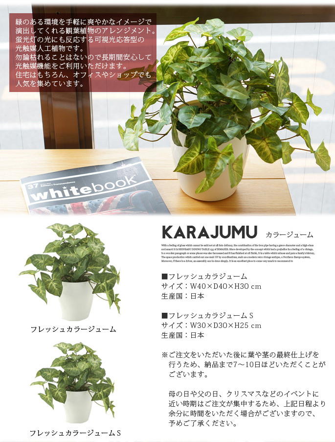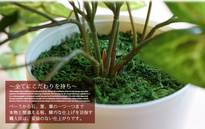 空間に癒しを与えてくれるイミテーショングリーンシリーズは、お手入れの必要が無く、気軽に生活に取り入れられる人工観葉植物です。リビングや寝室、書斎の他、オフィスや店舗などの使用にもおすすめです。防汚・抗菌・消臭効果を発揮する酸化チタン光触媒仕となっていますので、クリーンな環境を維持し、観葉植物が持つリラックス効果をさらに高めてくれます。