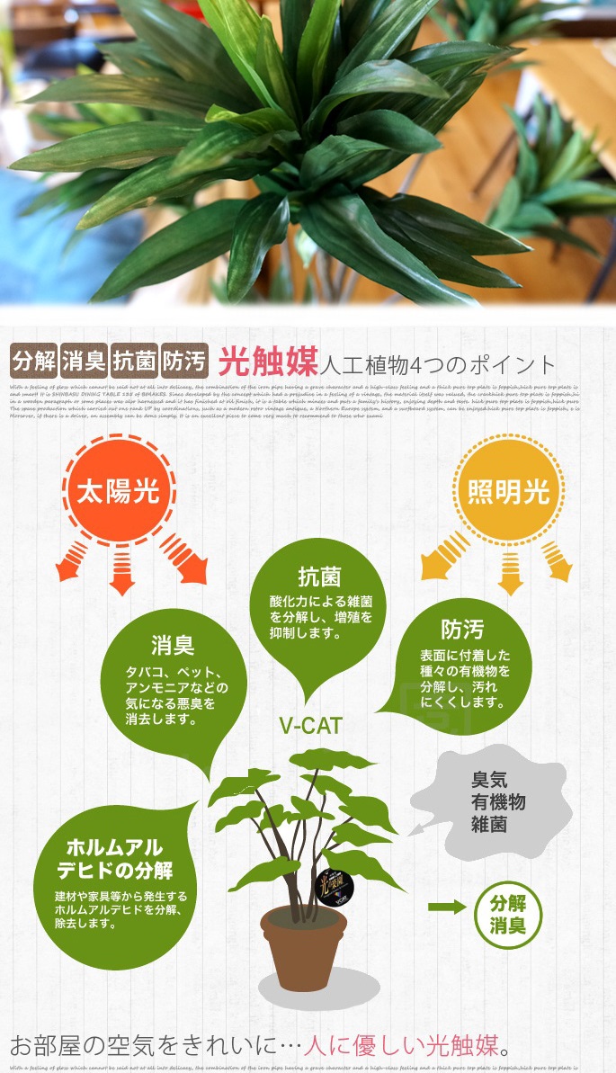 空間に癒しを与えてくれるイミテーショングリーンシリーズは、お手入れの必要が無く、気軽に生活に取り入れられる人工観葉植物です。リビングや寝室、書斎の他、オフィスや店舗などの使用にもおすすめです。防汚・抗菌・消臭効果を発揮する酸化チタン光触媒仕となっていますので、クリーンな環境を維持し、観葉植物が持つリラックス効果をさらに高めてくれます。
