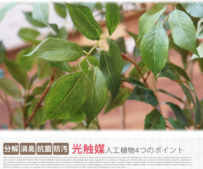 空間に癒しを与えてくれるイミテーショングリーンシリーズのマウンテンアッシュは太めの枝と小さめの葉が空間に絶妙なアクセントを加えるフェイクグリーンです。また、お手入れの必要が無く、気軽に生活に取り入れられる人工観葉植物です。リビングや寝室、書斎の他、オフィスや店舗などの使用にもおすすめです。防汚・抗菌・消臭効果を発揮する酸化チタン光触媒仕様となっていますので、クリーンな環境を維持し、観葉植物が持つリラックス効果をさらに高めてくれます。