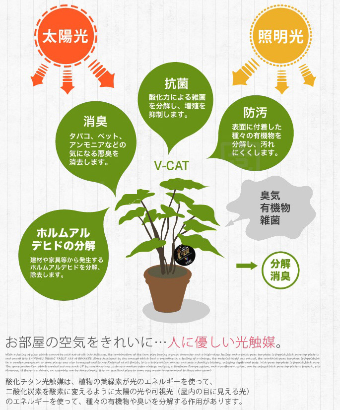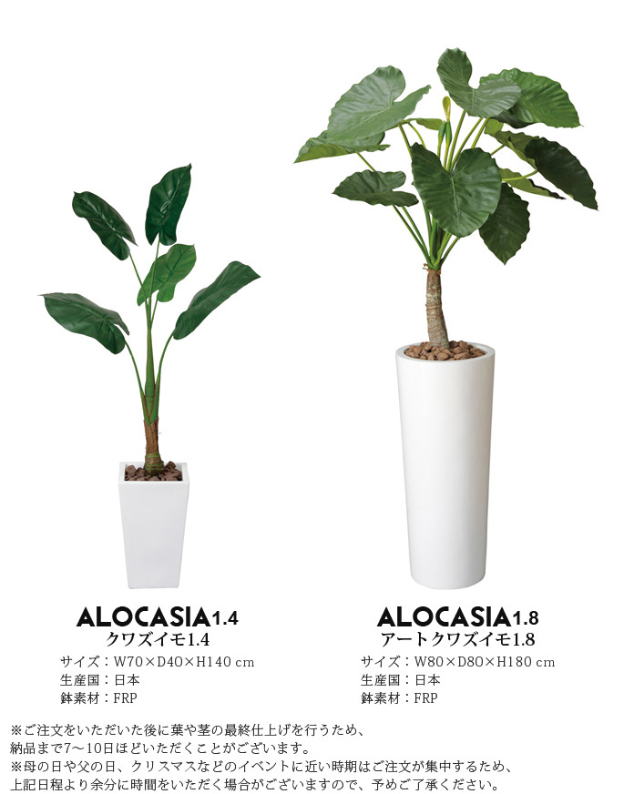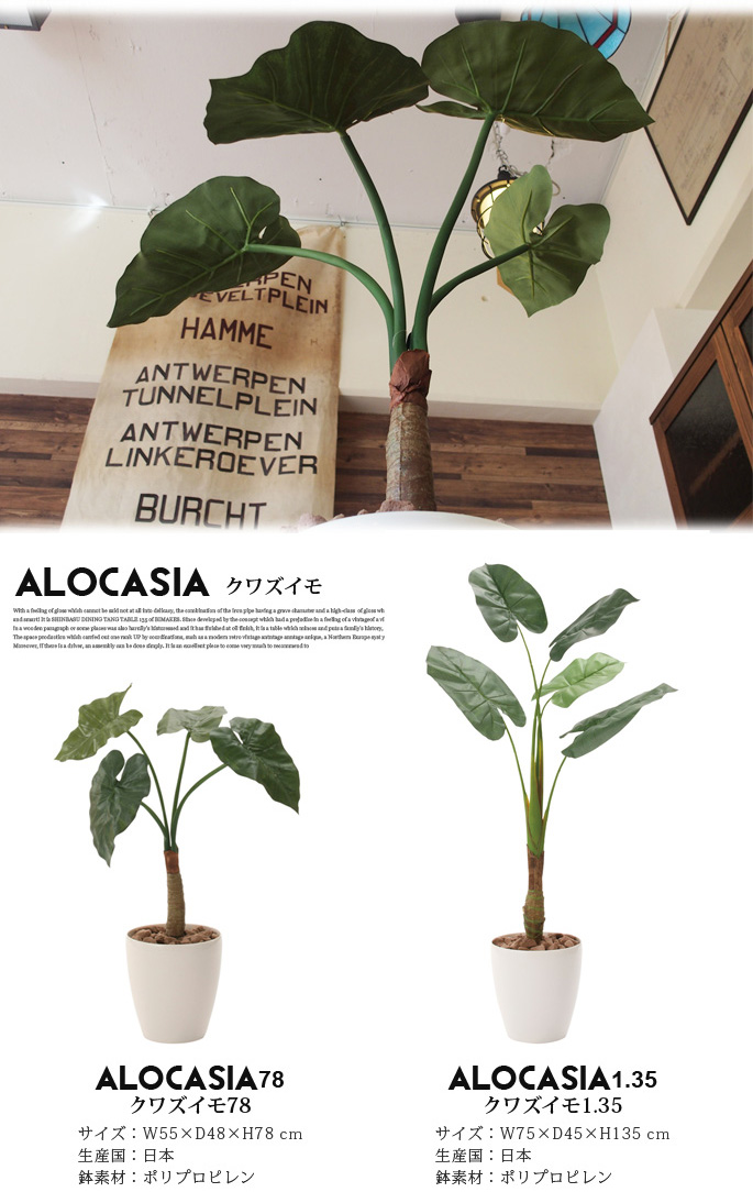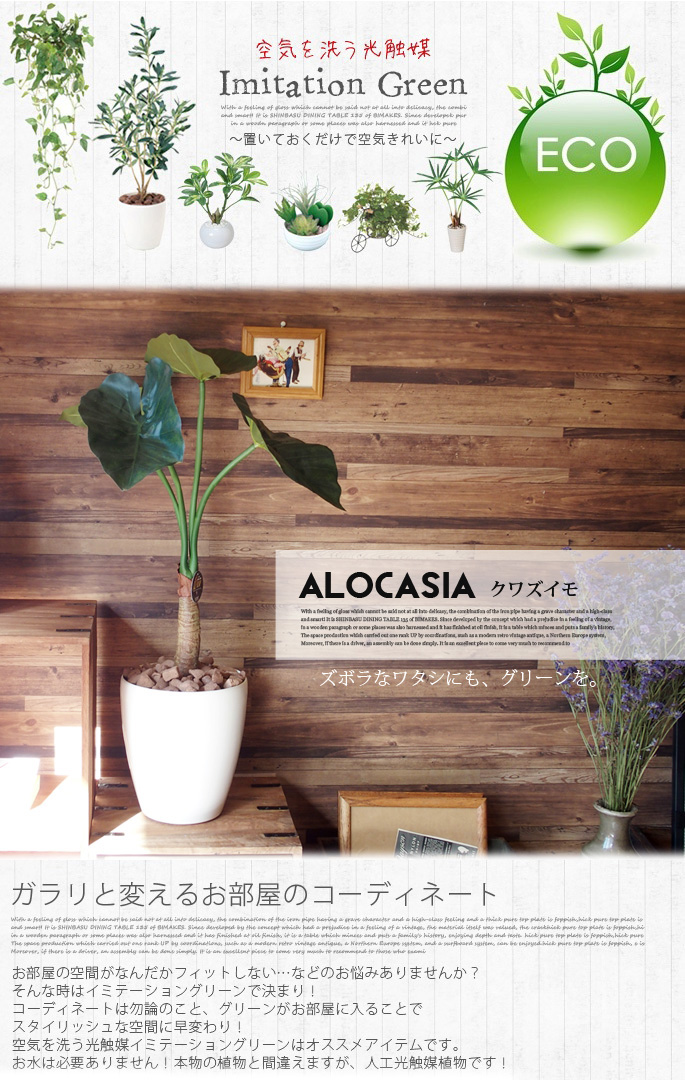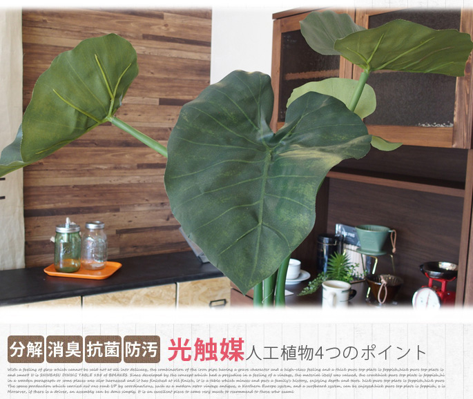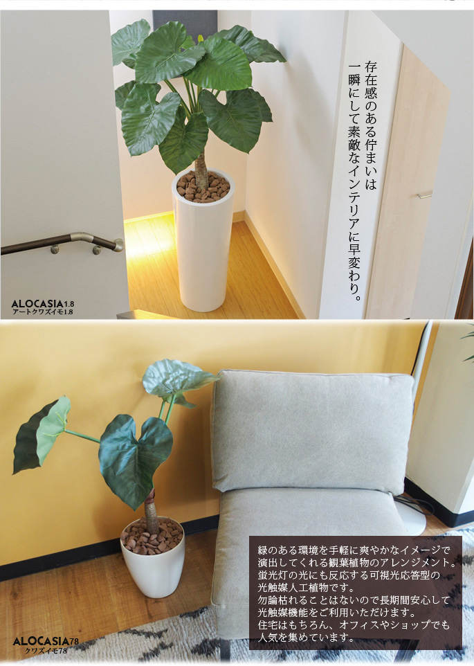 空間に癒しを与えてくれるイミテーショングリーンシリーズのくわず芋は太い幹と大きな葉が空間に絶妙なアクセントを加えるフェイクグリーンです。また、お手入れの必要が無く、気軽に生活に取り入れられる人工観葉植物です。リビングや寝室、書斎の他、オフィスや店舗などの使用にもおすすめです。防汚・抗菌・消臭効果を発揮する酸化チタン光触媒仕様となっていますので、クリーンな環境を維持し、観葉植物が持つリラックス効果をさらに高めてくれます。