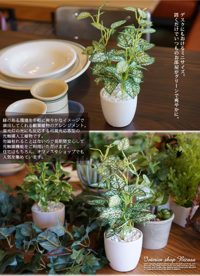 空間に癒しを与えてくれるイミテーショングリーンシリーズのミニピポエスタポットは班が入った葉のカラーが空間に絶妙なアクセントを加えるフェイクグリーンです。また、お手入れの必要が無く、気軽に生活に取り入れられる人工観葉植物です。リビングや寝室、書斎の他、オフィスや店舗などの使用にもおすすめです。防汚・抗菌・消臭効果を発揮する酸化チタン光触媒仕様となっていますので、クリーンな環境を維持し、観葉植物が持つリラックス効果をさらに高めてくれます。