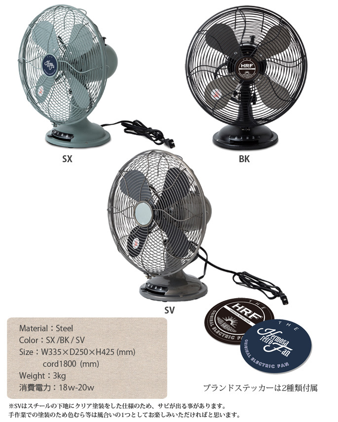 ハモサ(HARMOSA)のレトロファンテーブル(RETORO FAN TABLE) RF-011がデザインと機能のバージョンを上げ登場!どこか懐かしい雰囲気はそのままに風を送る羽は4枚に増えHERMOSAのNEWデザインロゴシールを携え、アメリカンレトロな雰囲気は維持したプロダクトです。風量は3段階で調節ができ、首振り機能が付いており、其々の操作パーツもクラシカルな雰囲気で仕上がっています。サーフスタイル・ビンテージスタイル等をお好みの方には是非お薦めの扇風機です。リビング・ダイニングの他、寝室、書斎など、様々なシーンで活躍するエコアイテムです。