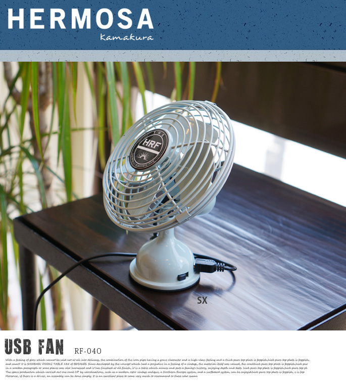 レトロビンテージ感たっぷりの大人気商品レトロファンシリーズにちっちゃくて可愛いUSBファンタイプが登場♪ハモサ(HERMOSA)のUSBファン(USB FAN)RF-040です。大きさは約W:125×D:95×H:145mmのサイズとなっており、大人の手の平にチョコンとのってしまうコンパクトサイズになっています。ミニサイズですが従来のレトロファンテーブルと同様のスチール素材となっております。アンティーク系・ビンテージ系・アメリカンスタイル系等の雰囲気がお好みの方には是非お奨めのUSB型扇風機です。見た目もCoolでカッコイイ♪PCファンで爽快感と涼感を味わってみて下さい!