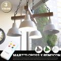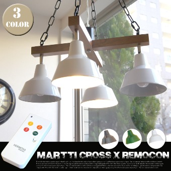 使い勝手の良いリモコン付きタイプで新登場!レトロ・ビンテージ・アンティーク・北欧等のテイストで斬新且つ洗練されたアイテムを揃えるハモサ(HERMOSA)の【リモコン マルティクロス(REMOCON MARTTI CROSS) EN-012R】です。シンプルウッドのバーに人気のマルティシェードを取付、空間に合わせた照度でご使用いただける多灯型リモコンライトです。手作業(ハンドメイド)で制作されたホーローシェードにチェーンコードをあしらい重厚感の中にもスッキリとした印象と高級感をあわせもつ天井照明です。シェードの角度はお好みによって変えることが可能で様々な照明演出を楽しめます。カラーはホワイト、グリーン、シルバーの3色展開です。