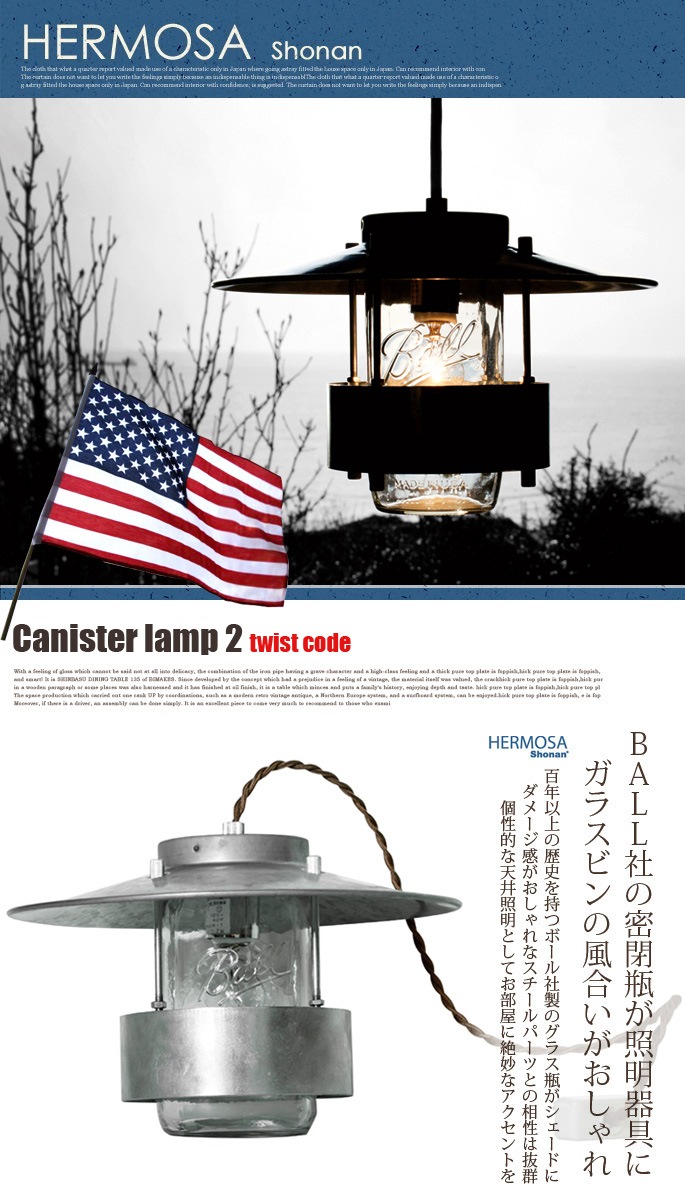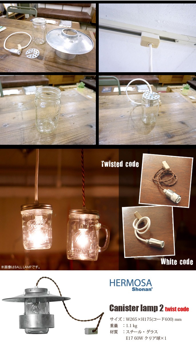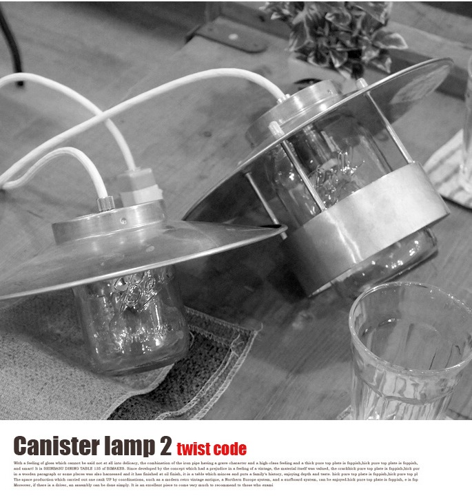 渋めのブラウンコードをねじったツイストコードがよりレトロな雰囲気を味わせるメイソンジャーペンダント!HERMOSA(ハモサ)の【CANISTER LAMP2(キャニスターランプ2) ツイストコードタイプ GS-004T】です。100年以上の歴史を持つアメリカ製BALL社の密閉瓶を使用し、インダストリアルな雰囲気と無骨感のあるスチールセードをミックスしたペンダントライトです。セードサイズは、W265 ×D265×H175mmのコード長さ600mmとなっており、もうワンサイズ小さいタイプもご用意しております。シリーズで其々ホワイトコードも用意しています。