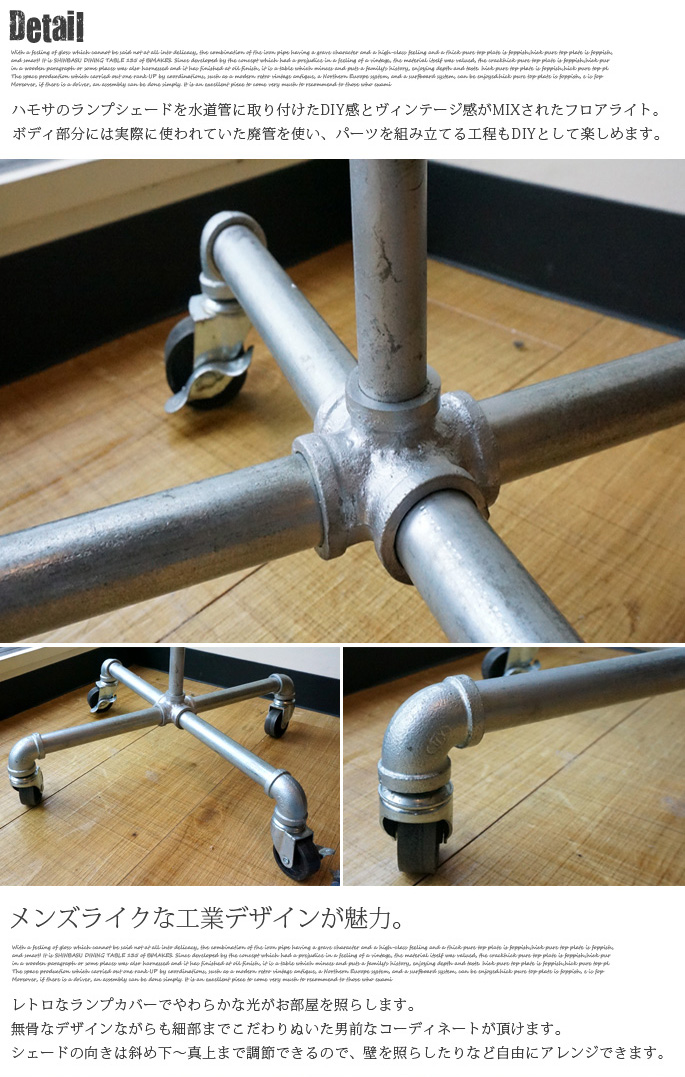 水道管をアレンジしたインダストリアルデザインがカッコいい♪ハモサ(HEMOSA)のHUNT FLOOR LAMP(ハントフロアランプ) CM-006です。ビンテージ感あるブラックセード仕上げ、年代を感じさせる佇まいとメタリック感がインダストリアルな雰囲気を助長させるプロダクトです。ただ今、最も旬なインテリアスタイルと言われているアメリカ西海岸テイストやレトロ・ビンテージの家具やサーフ系テイスト等にもピッタリなデザインとなっています。