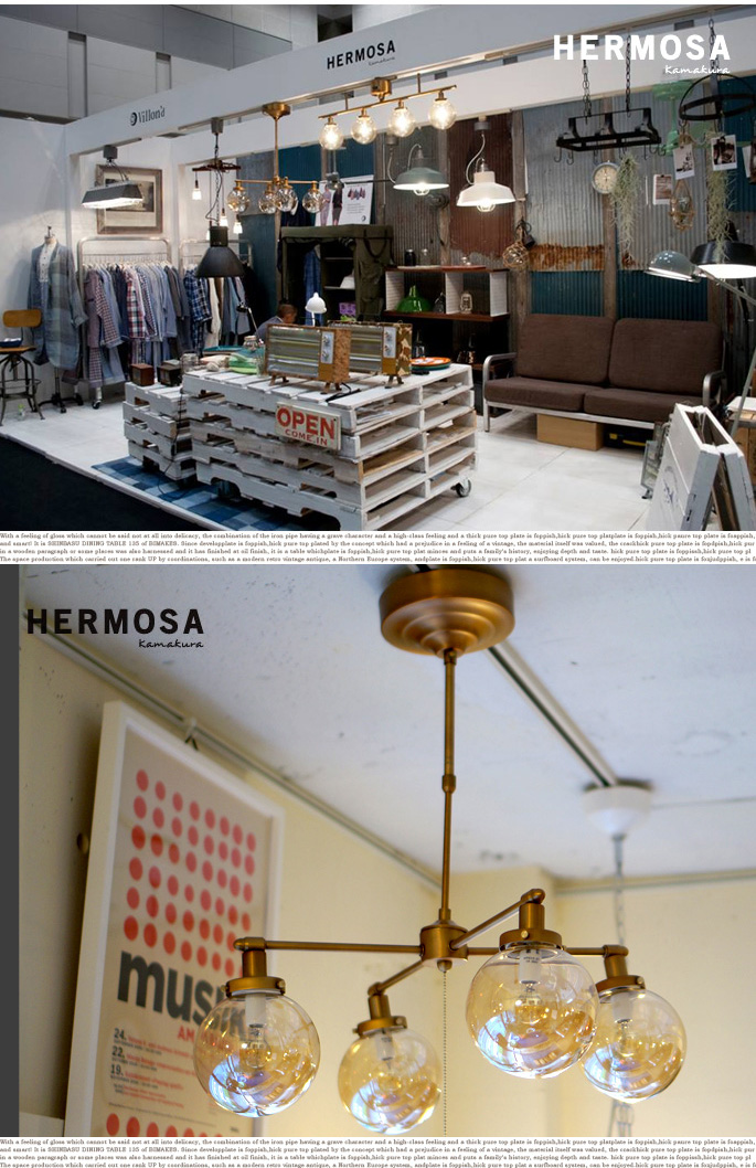 まるで真鍮かのような深みのあるゴールドフレームに少しブラウンがかった球体ガラスのコンビネーションが美しいHERMOSA(ハモサ)の【MOON CROSS LAMP(ムーンクロスランプ) GS-014GD】です。240ワットの明るさで約6畳分の明るさを確保し、やわらかい優しい光りを灯す天井用照明です。大きさはW650×D650×H696mmのサイズとなっており、プルスイッチを引っ張っていただくと2灯→2灯→全灯→OFFの4段階での調整が可能となっています。天井空間にある程度のボリューム感を演出することが出来る天井照明です。