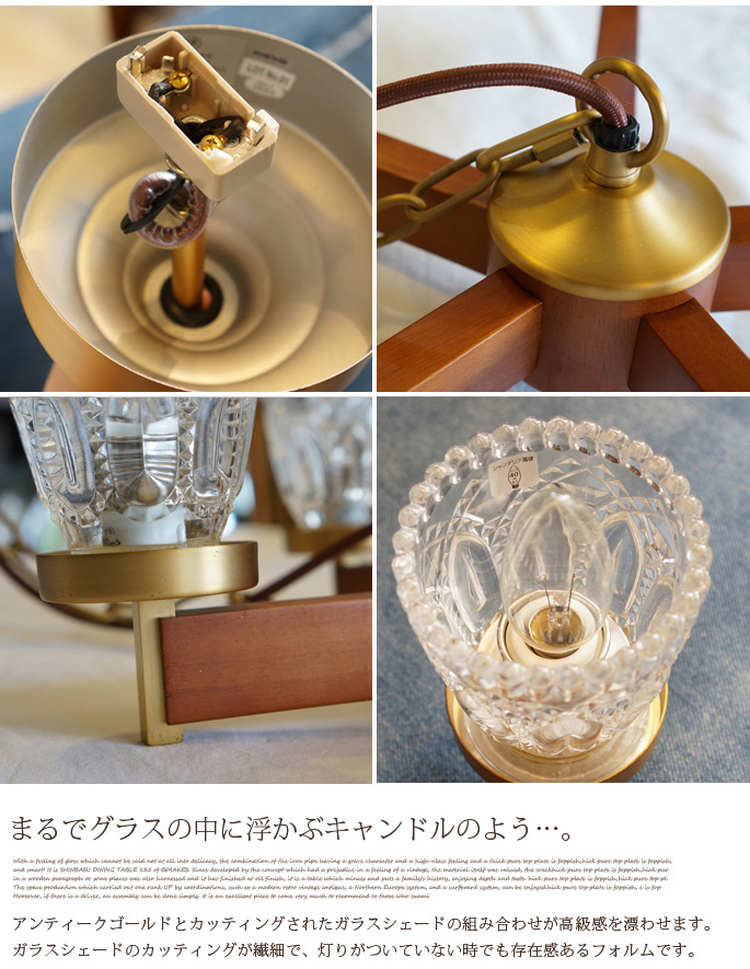 ハモサ(HERMOSA)のアルメリアシャンデリア(ARMERIA CHANDELIER) GL-005はウッドのボディとクラッシックなグラスシェード、アクセントのゴールドカラーがビンテージ感漂うおしゃれ空間を演出する天井照明です。灯具の雰囲気にマッチしたコードチェーンも含め、お部屋のアクセントにぴったりなフォルムなのでリビングや寝室、書斎など、様々なお部屋で用途に合わせた使用が可能です。