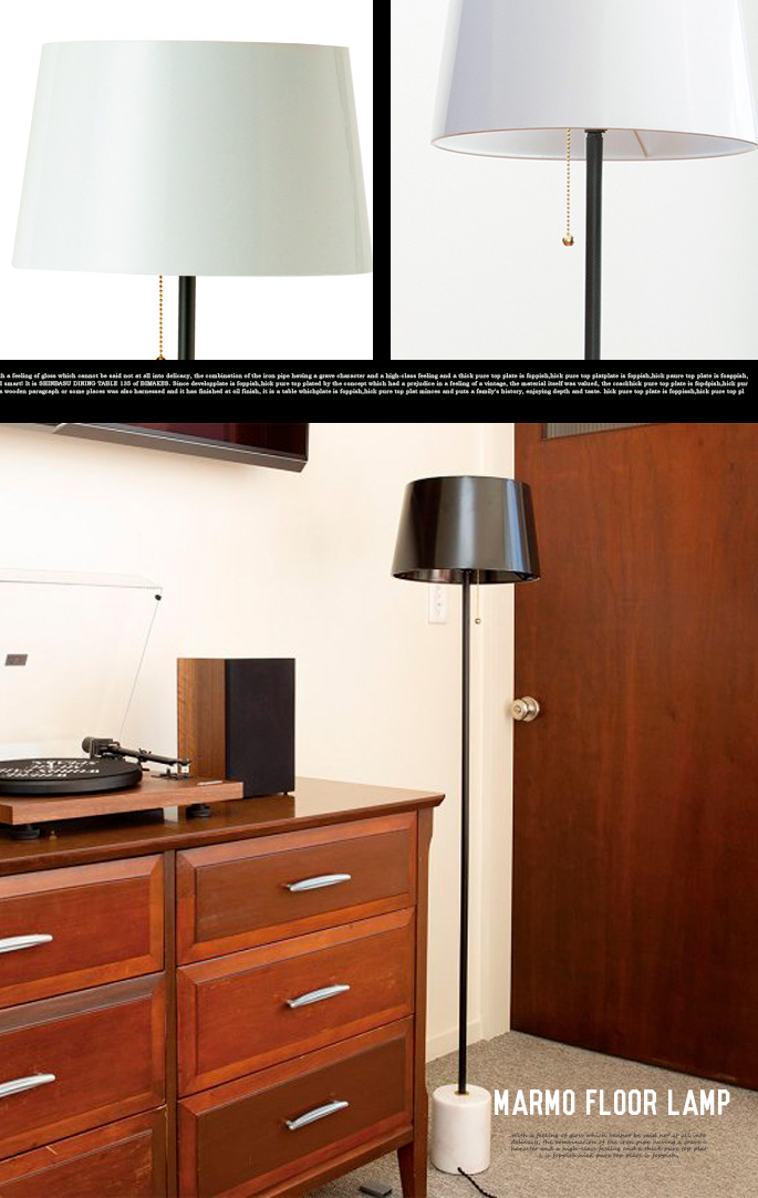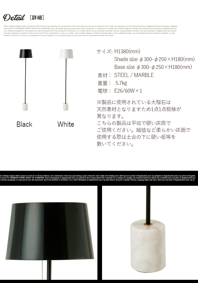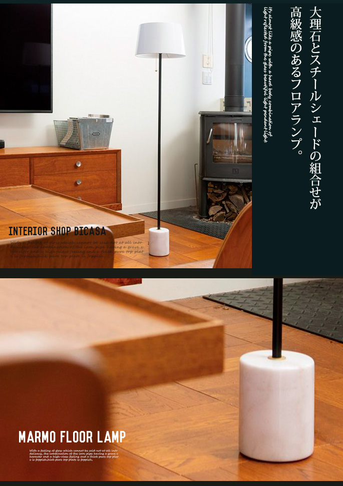 HERMOSA(ハモサ)のフロアランプです。大理石とスチールシェード を組み合わせ、シンプルな中にも高級感のある空間を演出し,お部屋の印象を変えることができます。重厚感のある大理石は高級感たっぷりで、真鍮色もアクセントになっています。大人な雰囲気がお好きな方にオススメです。