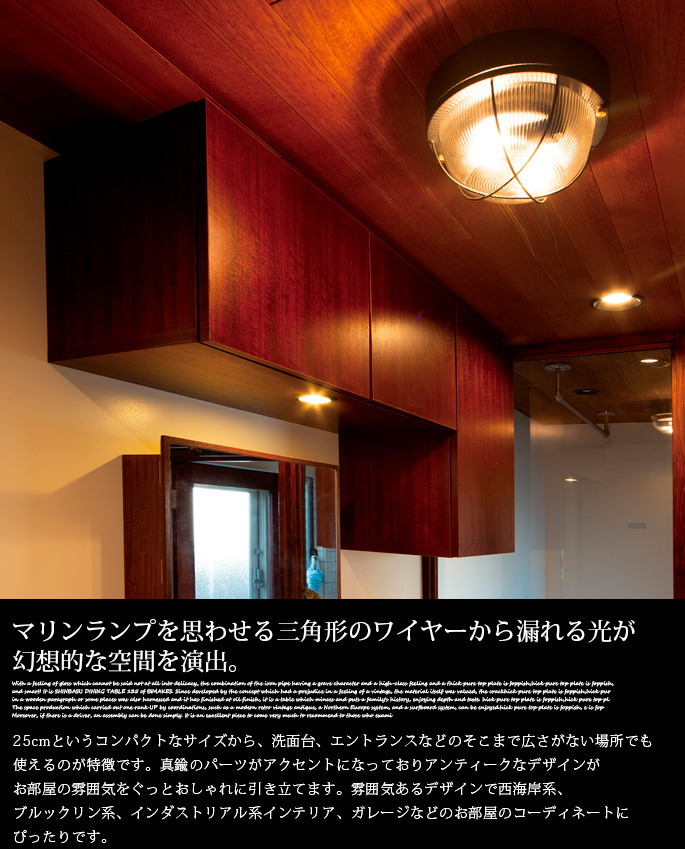 HERMOSA(ハモサ)のPORT CEILING LAMP(ポートシーリングランプ)は、天井照明、ブラケットライトとしても使えるシーリングランプです。ブラケットライトはリビングの吹き抜けや廊下、階段などの補助照明が必要な空間にご使用いただけます。また、特徴となっているワイヤーデザインが壁に映る光の漏れ方もおしゃれな空間を作り上げます。25cmというコンパクトなサイズで、洗面台やエントランスなど、そこまで広さがない場所にも使えるのが特徴。三角形に張っているワイヤーはヨーロッパのアンティークショップにあった照明をデザインヒントにしています。