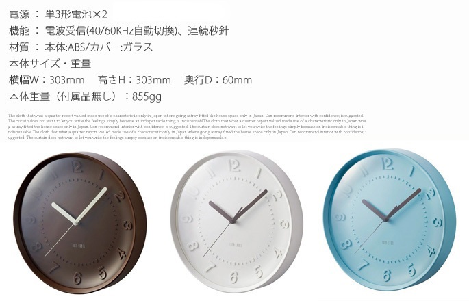 イデア(IDEA)の電波スイープウォールクロック(SweepWallClock)は静かに動く連続秒針が使用された電波時計なので、寝室や子供部屋など、どんなお部屋で使用しても安心な掛時計です。全体的にラウンドしているのが特徴のシンプルなフォルムはどんな壁面に使用してもすっきりと飾れます。カラーは壁面になじみやすいホワイトの他、お部屋のアクセントにぴったりなライトブルー、シックな雰囲気を醸し出すブラウンの3色からお選びいただけます。 |