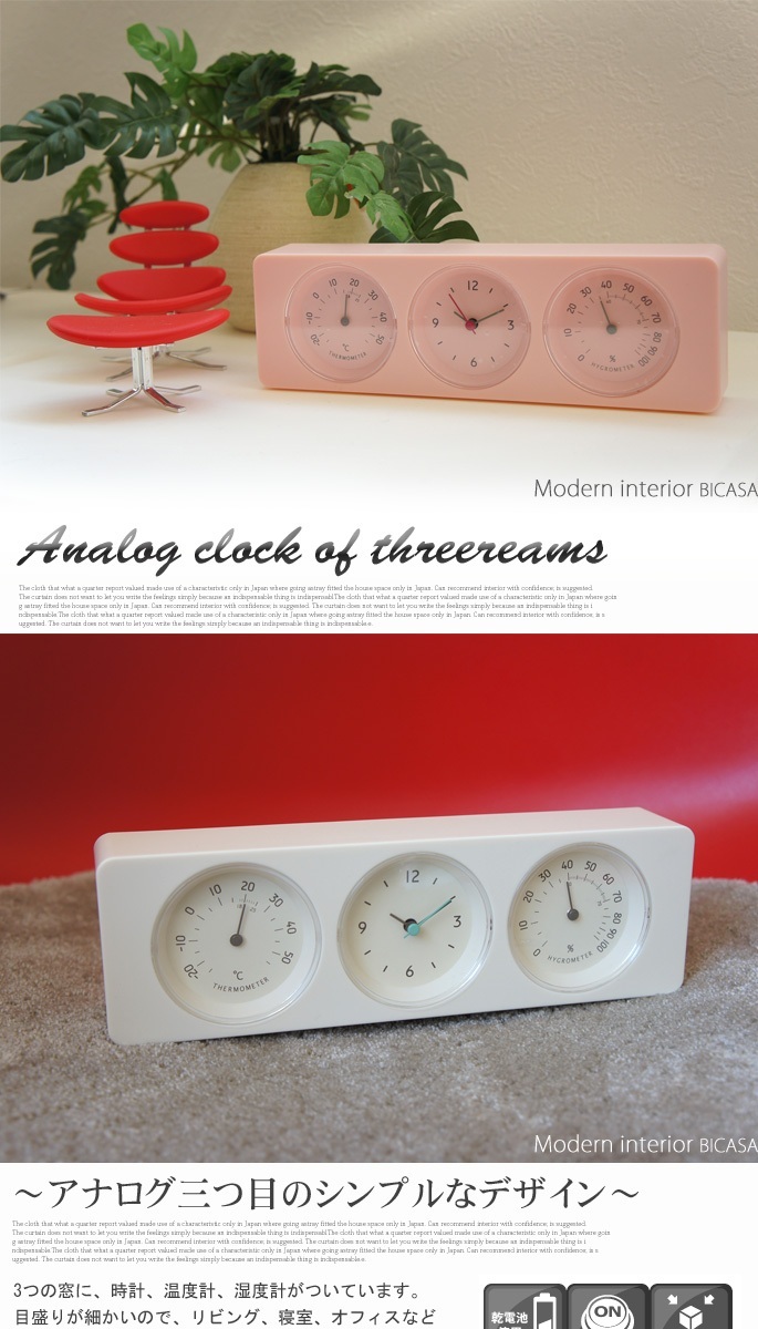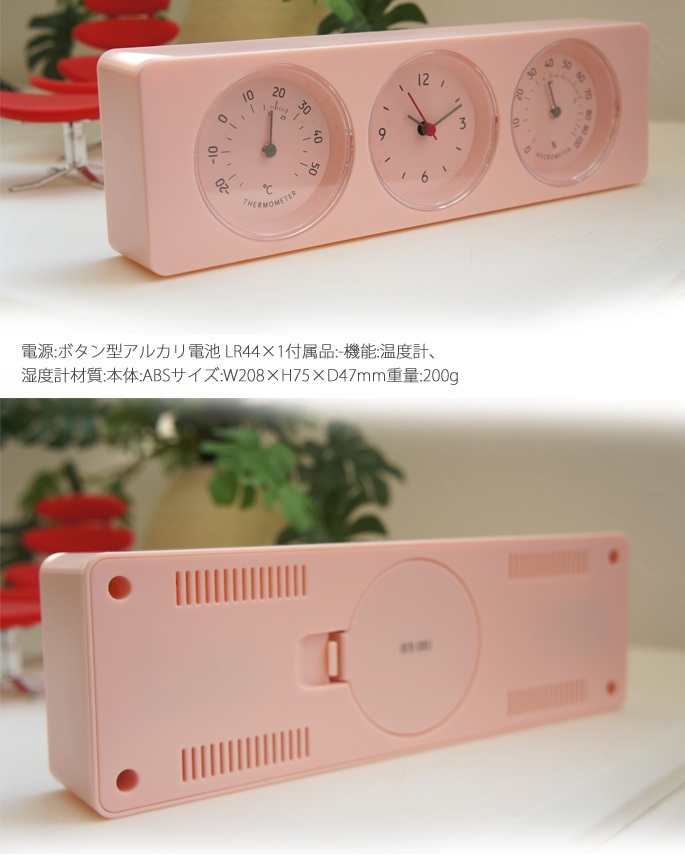 | コンパクトサイズでポップな感じそしてあったら良いなと思える便利グッズ(役立つアイテム)!イデアレーベルの【アナログ3連温湿時計 LCD022-WH/BE/PK】です。3連の小窓は向かって左側から温度計・時刻(時計)・湿度計となっており細かな目盛り付のデザインとなっています。 ボタン型アルカリ電池 LR44×1個を動力源にした機能時計は、ちょっとした贈物にも喜ばれるスマートなお洒落アイテムです♪ |