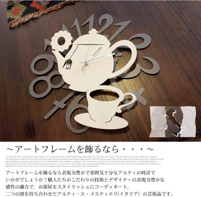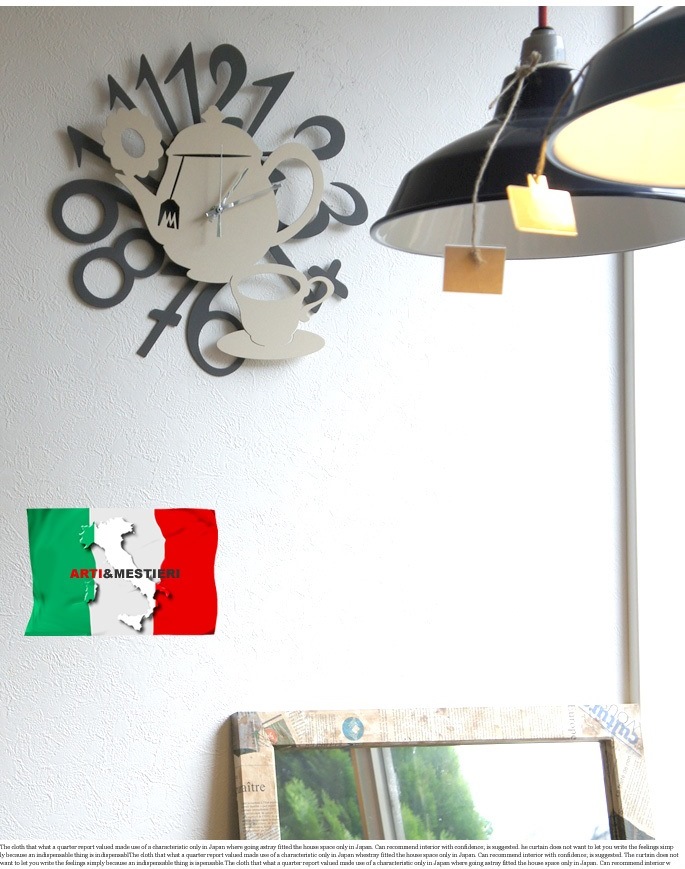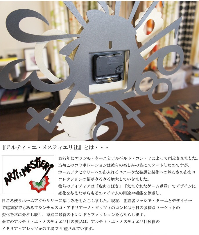個性的でおしゃれなデザインのホームアクセサリーを手掛けるアルティ・エ・メスティエリ(ARTI&MESTIERI)のTEIERA(ティエラ)はティーポットを文字盤にあしらいティーカップも含め、かわいらしくおしゃれなフォルムが魅力のウォールクロックです。ティータイムのくつろぎ空間をイメージした見るのが楽しくなるデザインの壁掛け時計をリビングやダイニング、寝室の壁面アクセントとして飾ってみてはいかがでしょうか。イタリア製ならではのデザインだけでなく、ドイツ製ムーブメントを使用するなど時計としての品質も抜群です。