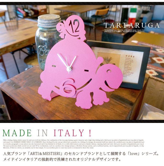 個性的なホームアクセサリーを手掛けるアルティ・エ・メスティエリ(ARTI&MESTIERI)の姉妹ブランドLOVE(ラブ)のTARTARUGA(タルタルーガ)は親亀と子亀が仲良く散歩をしているようなデザインがかわいらしい置時計です。カメのシルエットを生かした文字盤が魅力の置き時計をアート感覚でリビングやダイニング、寝室のアクセントとして飾ってみてはいかがでしょうか。イタリア製ならではのデザインだけでなく、時計としての品質も抜群です。