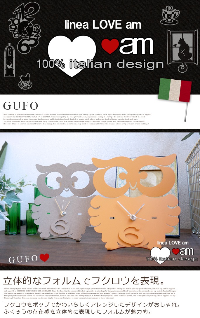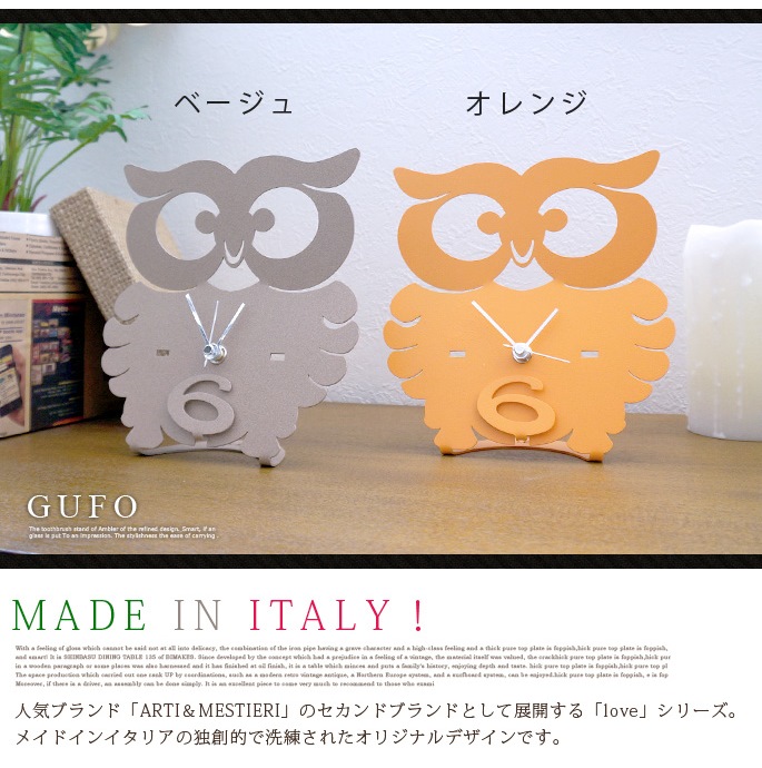 個性的なホームアクセサリーを手掛けるアルティ・エ・メスティエリ(ARTI&MESTIERI)の姉妹ブランドLOVE(ラブ)のGUFO(グーフォ)はフクロウをポップでかわいらしくアレンジしたデザインがおしゃれな置時計です。ふくろうの存在感を立体的に表現したフォルムが魅力の置き時計をアート感覚でリビングやダイニング、寝室のアクセントとして飾ってみてはいかがでしょうか。イタリア製ならではのデザインだけでなく、時計としての品質も抜群です。
