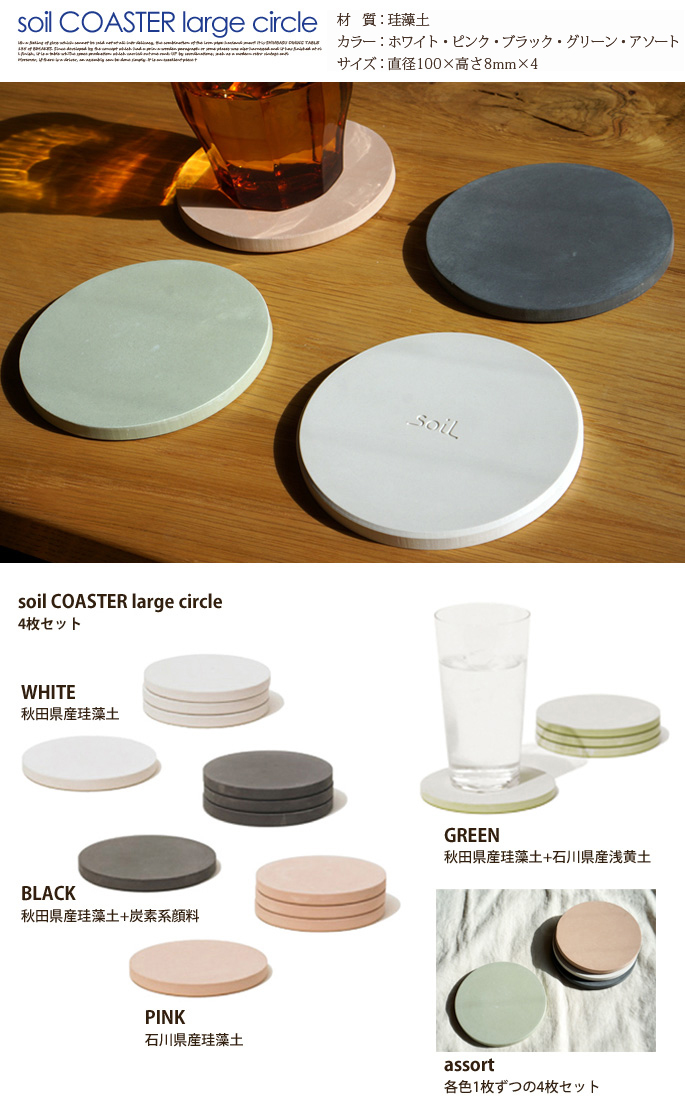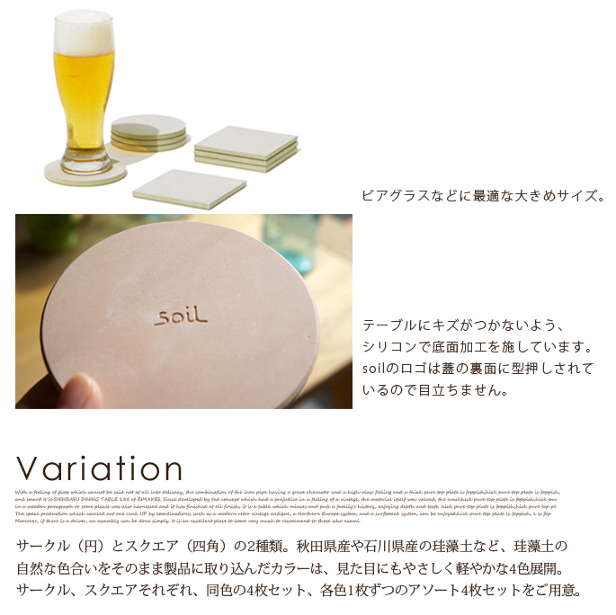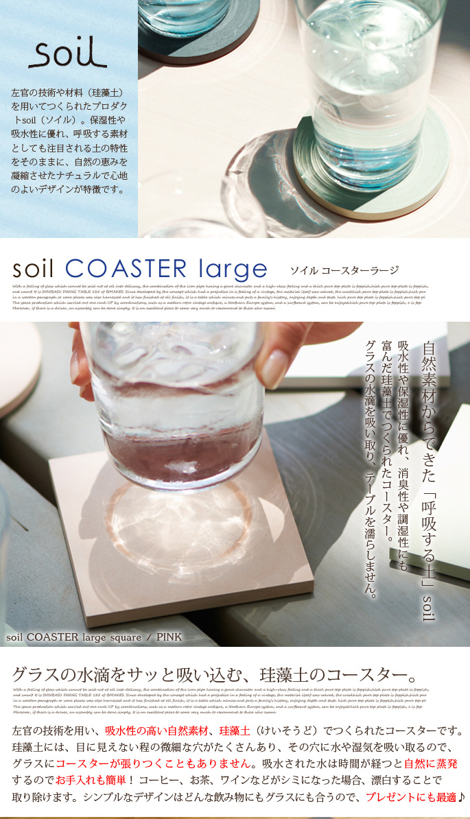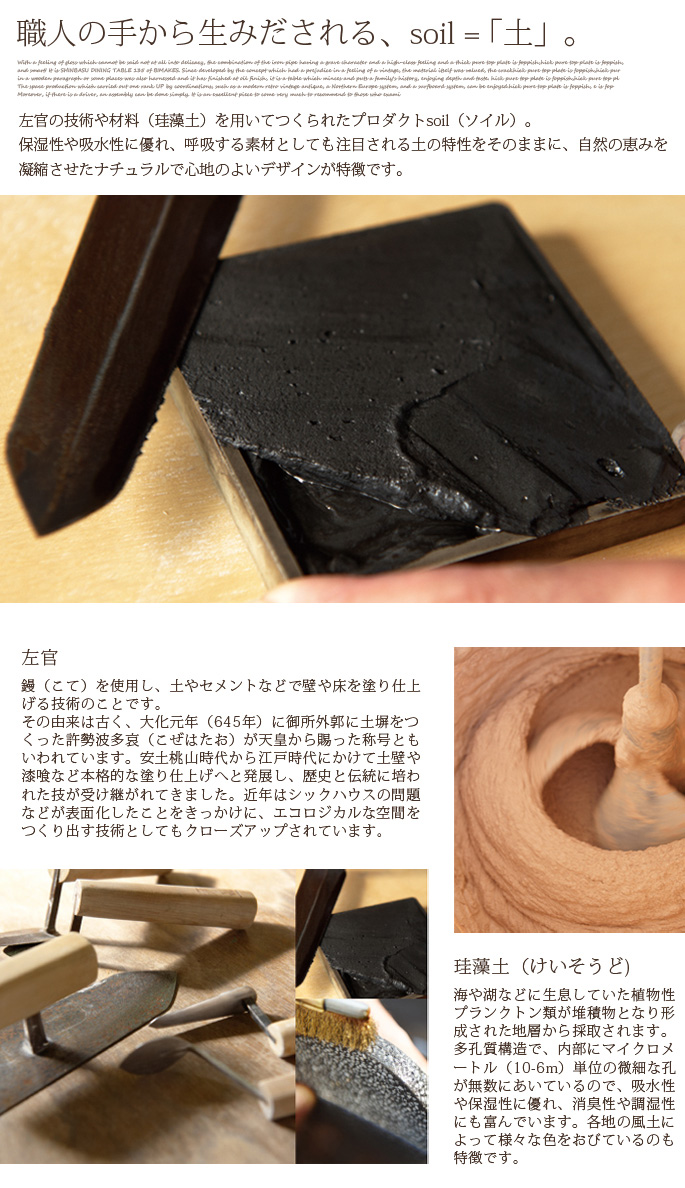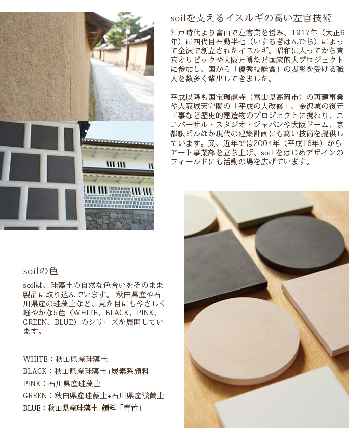 人や環境に優しいジャパンプロダクト「Soil」シリーズは、日本独自の素材・技術を用いた高品質の日用品です。全ての製品に使用される珪藻土(けいそうど)は、「呼吸する自然素材」と呼ばれ、保湿性や吸水性に優れ、水気をサラリと吸い取って大気中に放出してくれます。製品は左官職人による手作りで製作され、メーカーであるイスルギは、大正6年の創業から80余年に渡り左官技術を守り続ける老舗です。珪藻土の主成分は植物性プランクトン類の化石、珪藻殻の堆積物なので、寿命がきたら土に還るエコ素材です。日本では古くから建材などに使用されているので、耐久性も安心です。